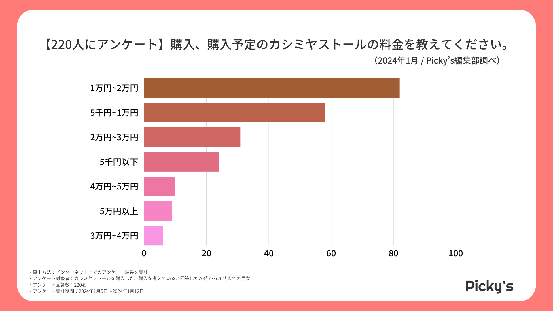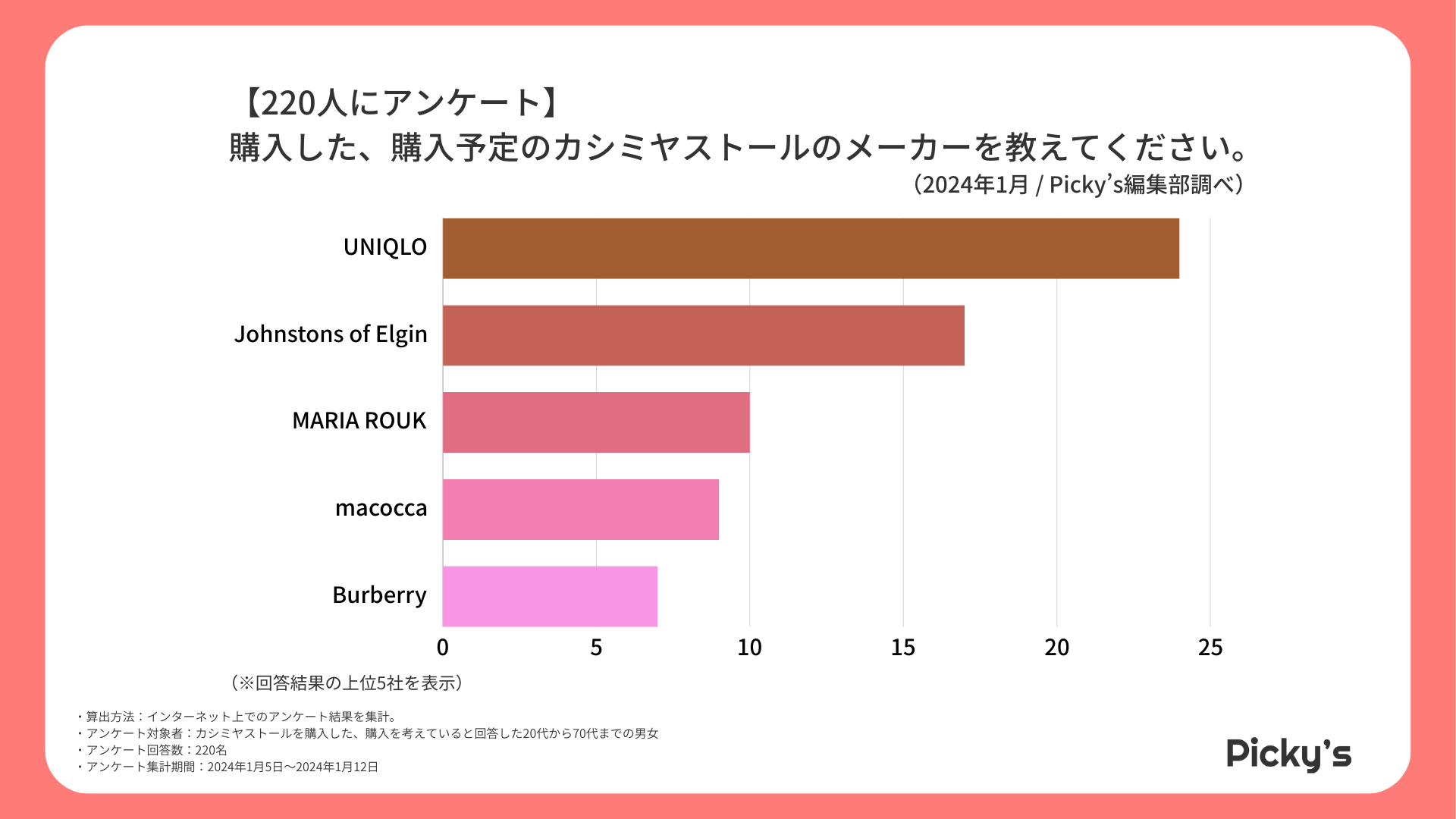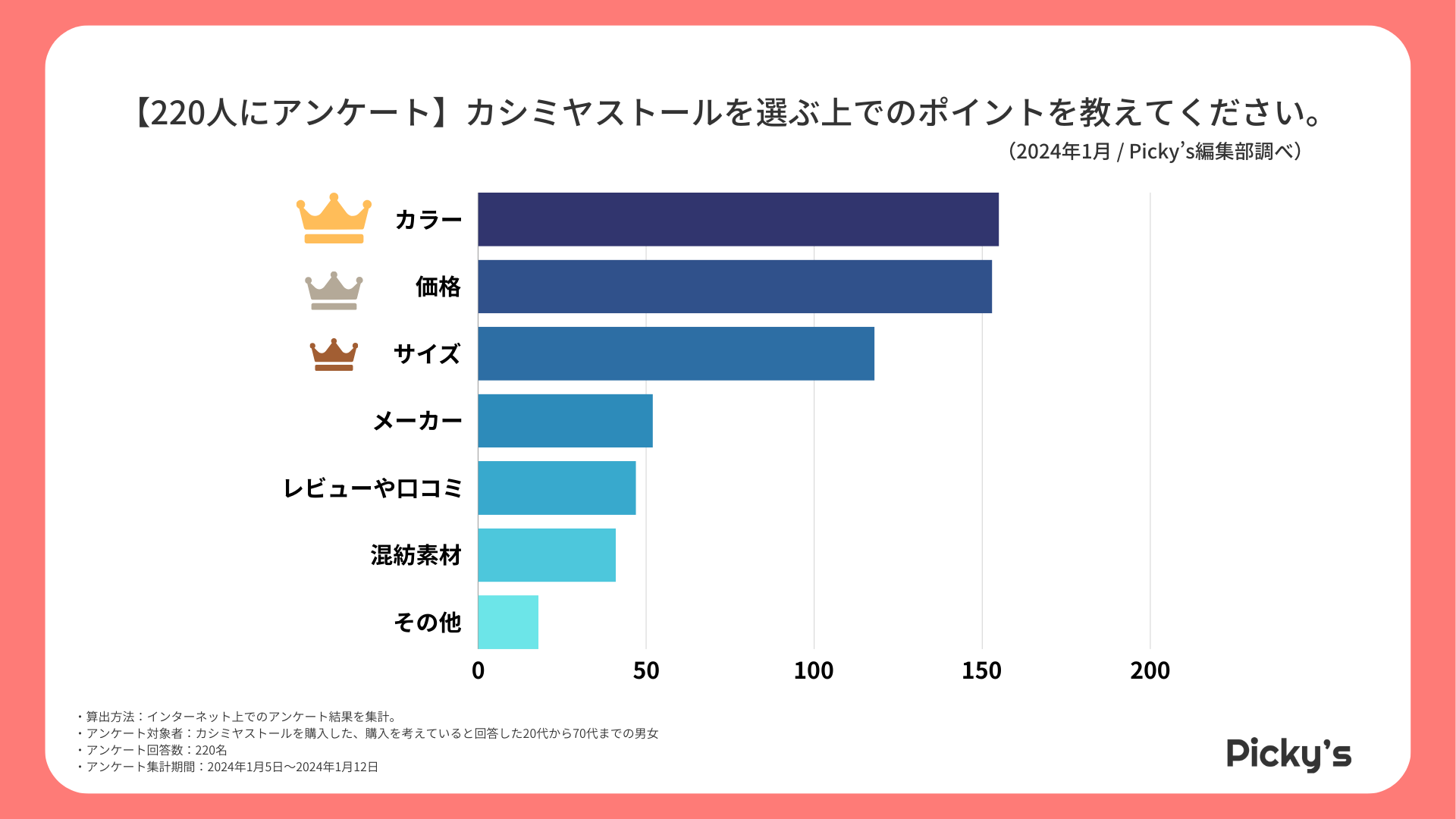「Picky’s」は、インターネットショッピングにおいて、購入前に試せない・選ぶべきものがわからないという課題の解決を目標に、あらゆる商品のおすすめランキングや検証レビューを紹介するサイトです。このたびPicky’s(https://rentry.jp/)では、カシミヤストールについてインターネット上でアンケート調査を行いましたので発表いたします。