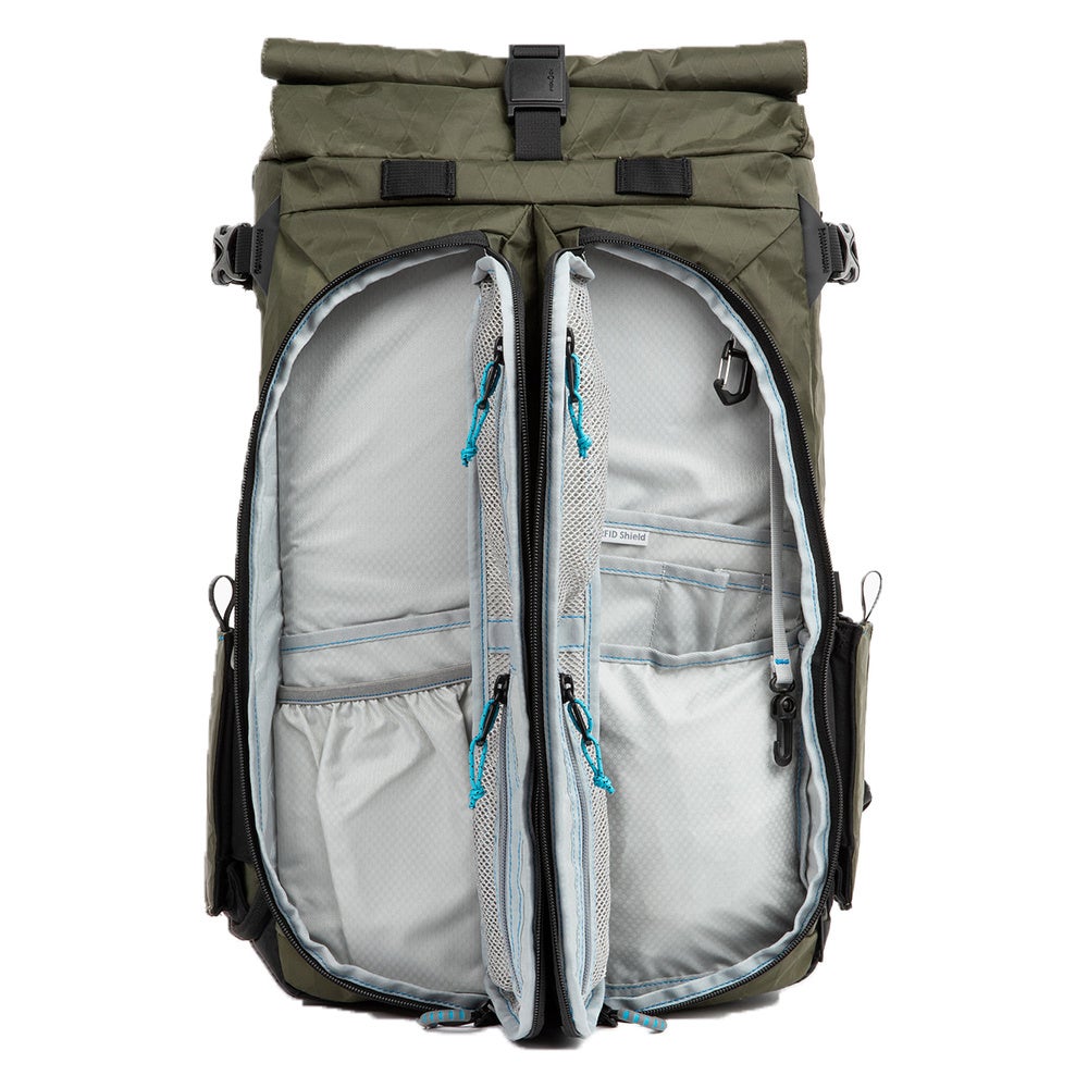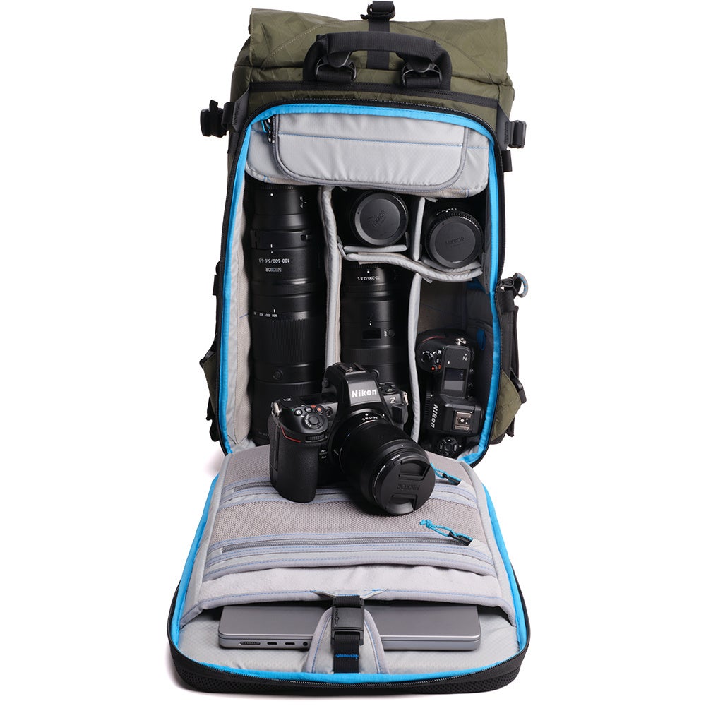 ロールトップ式のメインコンパートメントを備え、容量は26Lから最大31Lまで拡張可能です。大型のカメラ機材に加え、日常の必需品も快適に持ち運べる、多くの収納スペースを必要とするフォトグラファー向け設計です。