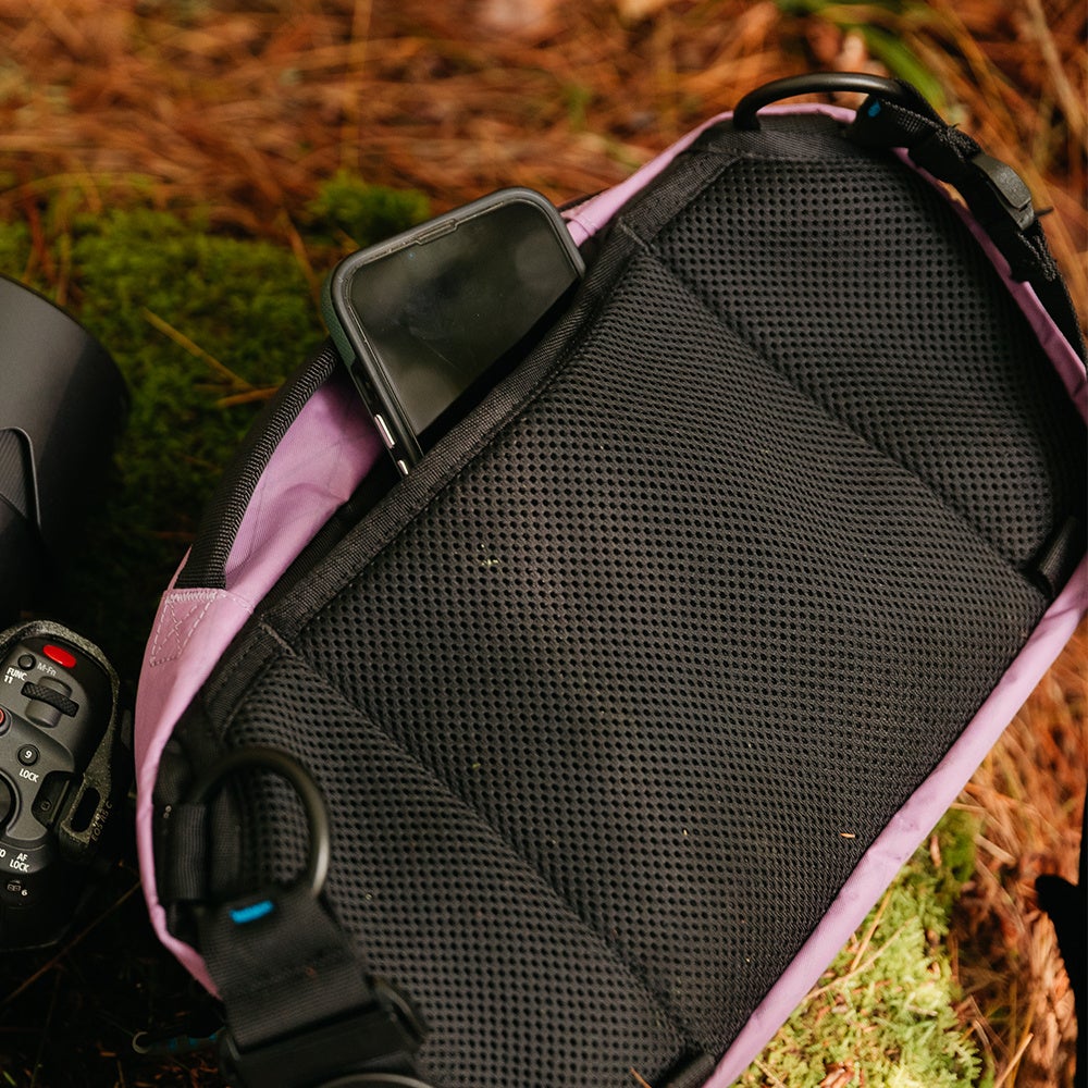 ショルダーストラップには滑り止めとパッドが設けられ、アジャスターにより指一本で簡単に長さ調節が可能です。また、バッグをウエスト部分でかまえたときに水平になりやすいように設計されており、メインコンパートメントへアクセスしやすく、レンズ交換もスムーズに行えます。