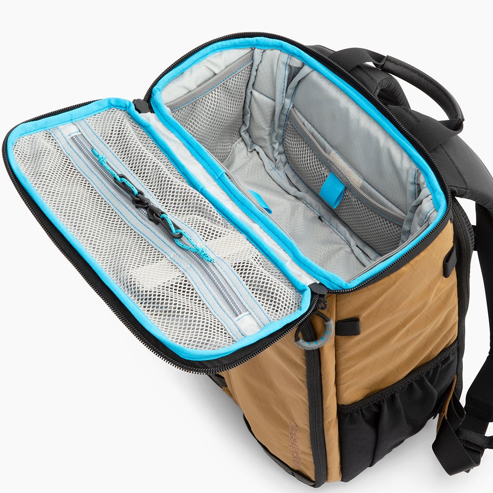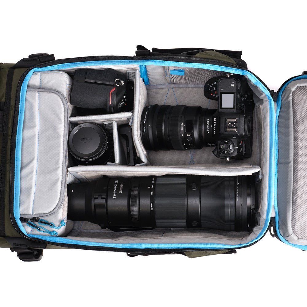 メインコンパートメントへは背中側から大きく開くダブルジッパーでアクセスでき、機材を安全に取り出せます。ディバイダーには薄型・軽量ながら耐衝撃性に優れたArtilon foam(アーティリオン フォーム)を採用。バッグを下ろさずに中身を取り出せるサイドパネルも装備しています。