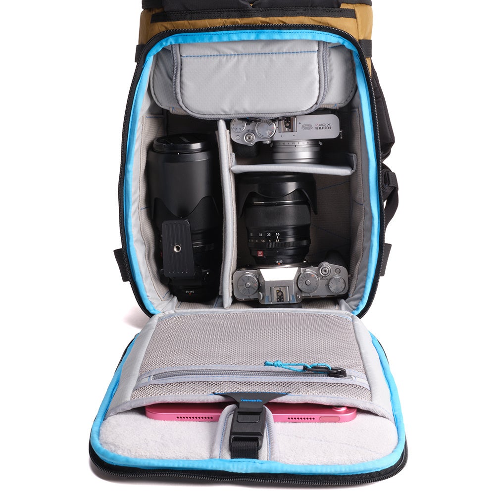 ディバイダーには薄型・軽量ながら耐衝撃性に優れたArtilon foam(アーティリオン フォーム)を採用。外側には軽量でありながら耐久性と耐候性に優れたX-Pac VX-21生地を採用し、悪天候から機材をしっかりと守ります。