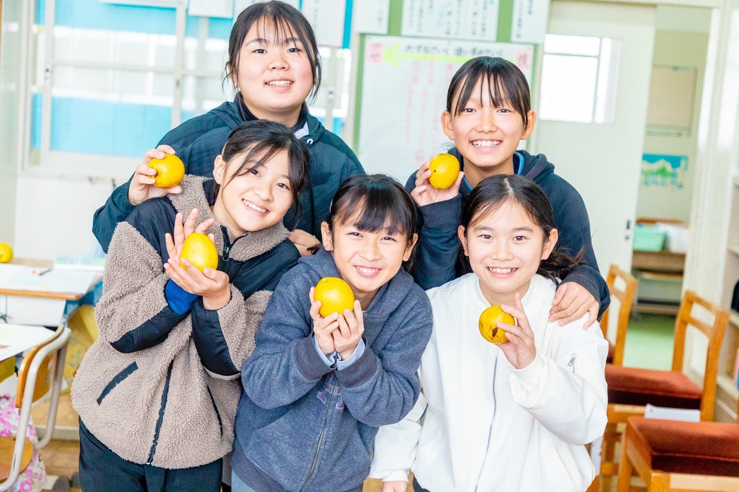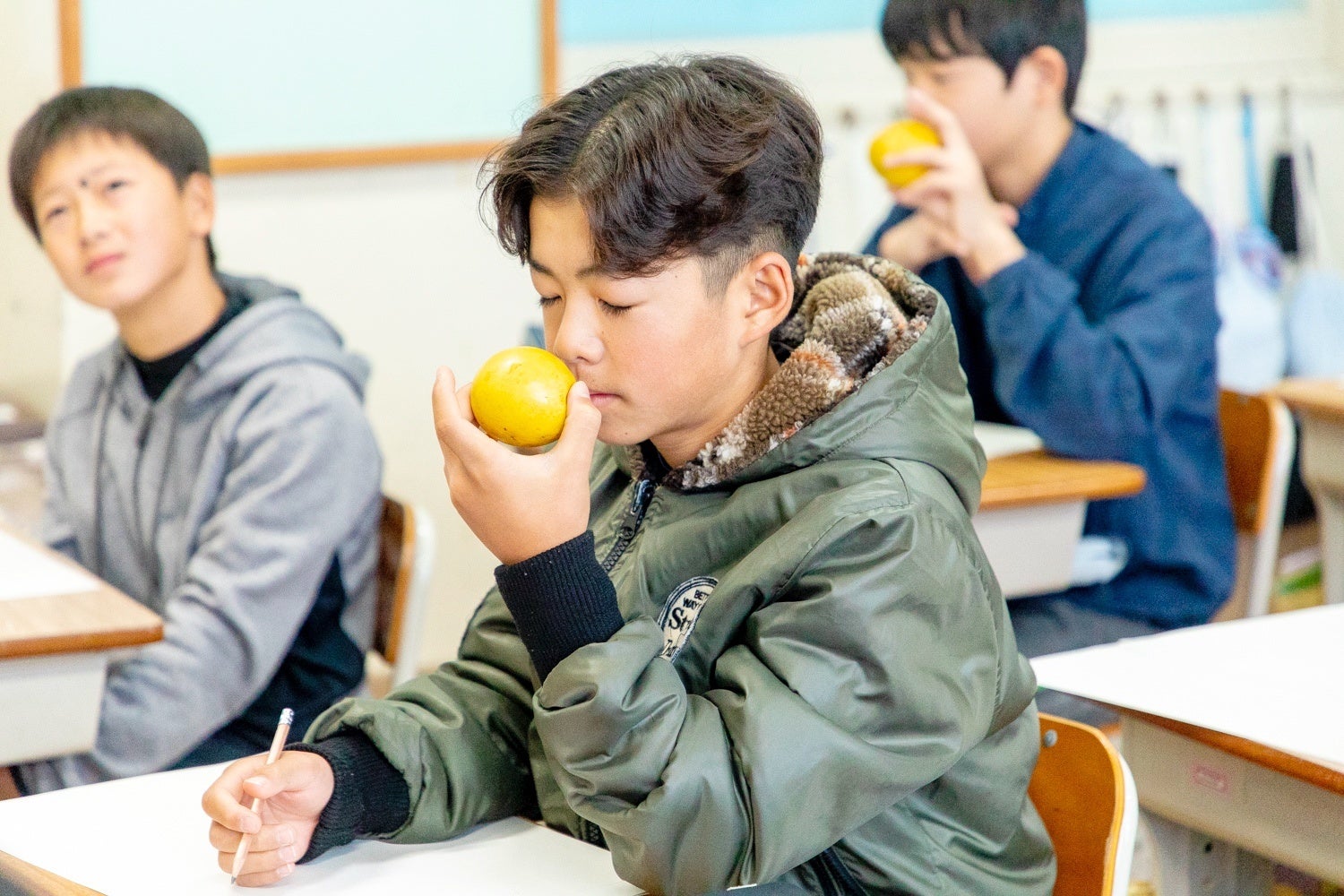 今回は、壱岐市立筒城小学校の5・6年生を対象に授業を実施。保護者様のご協力のもと、島内で実りの時期を迎える花梨(かりん)の香りを採用しました。生徒たちにとって、初めて目にする果実には先入観がない様子。その香りから連想されたイメージには、「しょっぱい感じ」「おばあちゃんの家を思い出した」「お花畑」「ヒヨコ」など、意外な印象を表す言葉が口々に飛び交い、しなやかな感性に満ちた14名それぞれの素敵な物語が生まれました。