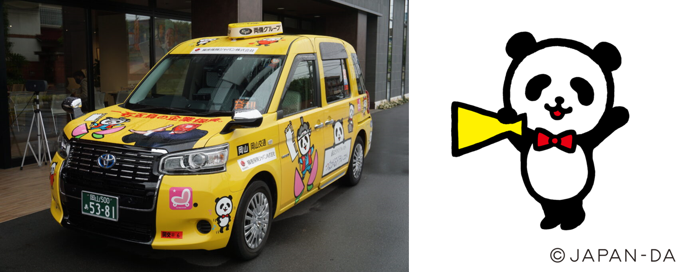 損保ジャパンのキャラクター、ジャパンダの着ぐるみが登場します。ジャパンダは、災害時の被災者支援を連携して行なう協定を損保ジャパン・岡山NPOセンター・岡山交通の3者で結んだ際に誕生した「ジャパンダタクシー」のラッピングにも起用されています。