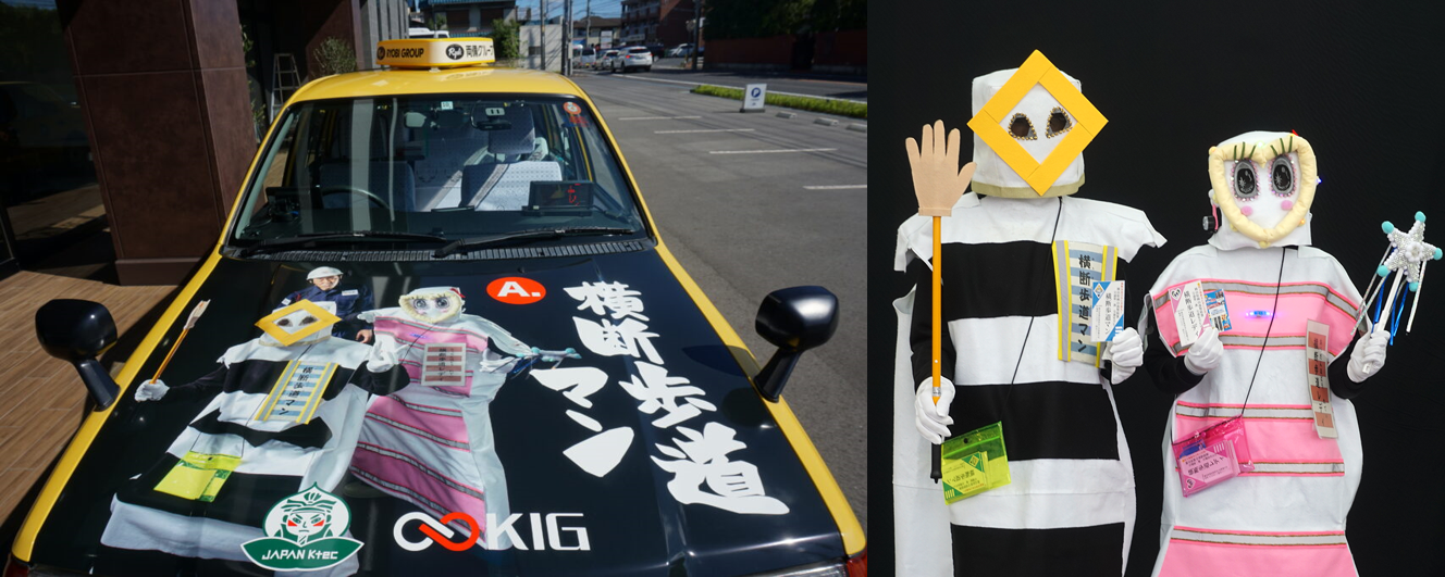 交通安全を啓発するために誕生した、岡山南警察署オリジナルヒーローの横断歩道マン・レディ。ユニークな風貌から話題となり、現在「交通安全啓発タクシー」のラッピングに起用されています。