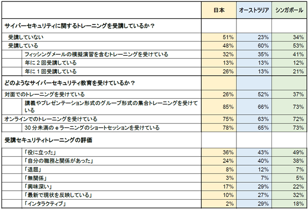 さらに、KnowBe4 Japanが日本、オーストラリア、シンガポールの3地域の調査結果を比較することで、日本におけるサイバーセキュリティ対策の現状を次の7つから考察しています。