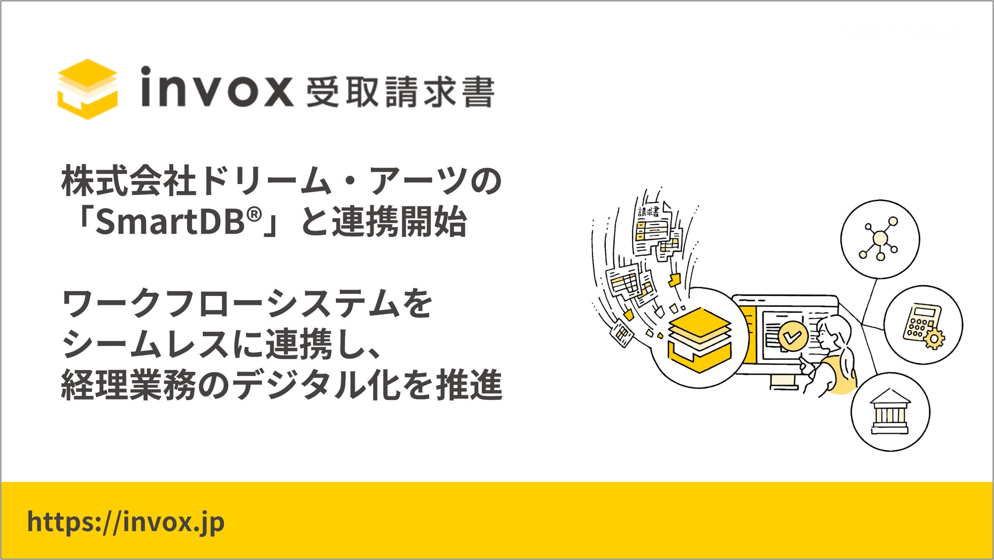 株式会社invox(本社:東京都新宿区、代表取締役:横井 朗)が開発・運営する「invox受取請求書」は、株式会社ドリーム・アーツ(東京本社:東京都渋谷区、広島本社:広島県広島市、代表取締役社長:山本 孝昭)が提供する大企業向け業務デジタル化クラウド「SmartDB®(スマートデービー)」とAPI連携を開始しました。