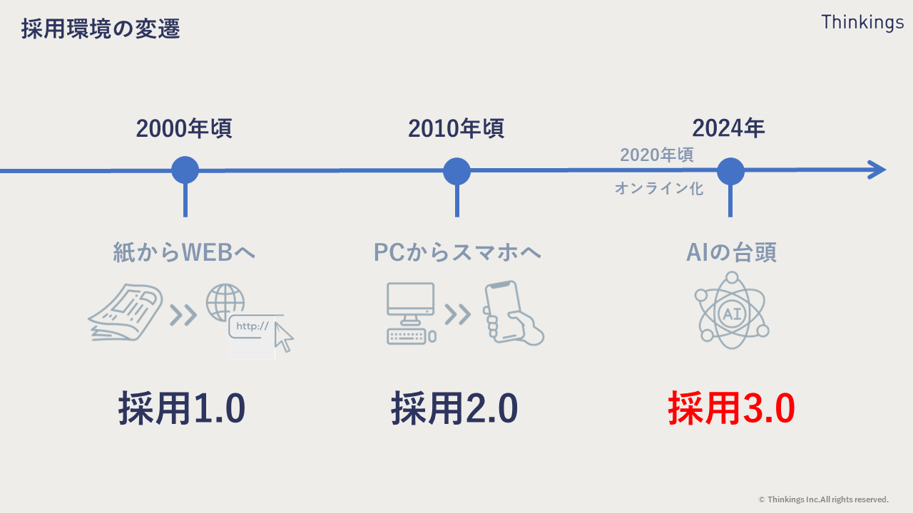採用環境は、テクノロジーの進化により約10年刻みで変革が起きてきたことがわかります。
