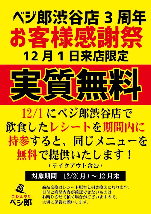 『肉野菜炒め ベジ郎渋谷総本店』3周年記念お客様感謝祭 飲食代実質無料!!