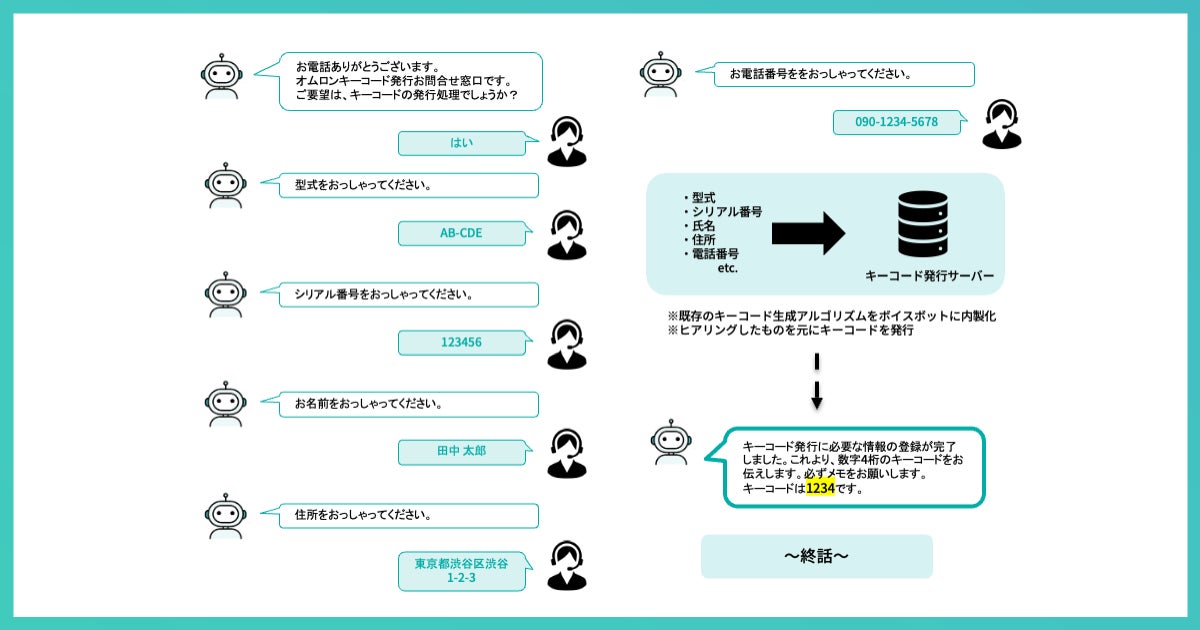 ボイスボットがキーコード発行に必要な情報をヒアリングし、登録が完了すると、ボイスボットからキーコード発行の案内が行われます。また、本取り組みでは、ボイスボット内にキーコードを発行する仕組みを構築しているので、迅速かつ正確な対応を実現しております。