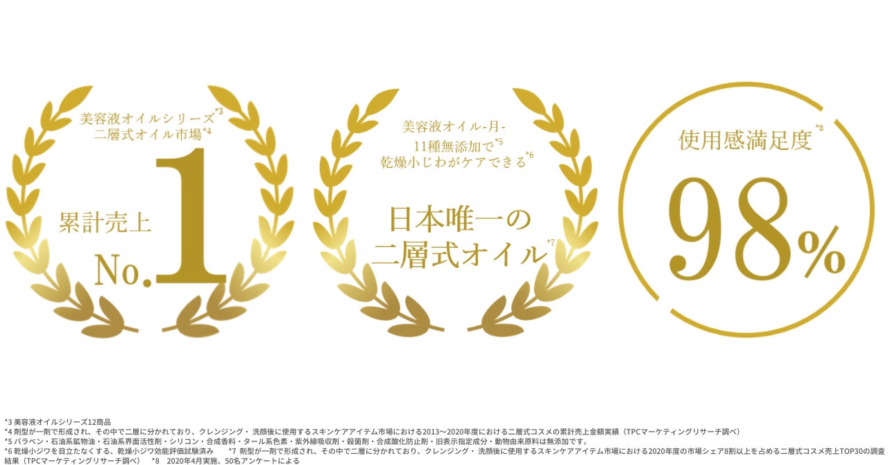 ※2:通販チャネルにて、天然植物原料を主成分として訴求し、かつ化学合成成分、 肌に負担をかける恐れのある成分の配合を極力抑制(※無合成香料・無合成着色料・ 無鉱物油・パラベンフリー・ノンアルコール・石油系界面活性剤フリーの6種のうち4種類以上を実現)し、年齢に応じたお手入れにおいて、ハリ・透明感・潤いなど加齢に伴う肌悩みに向き合った訴求を行う化粧品市場における2013年度~2021年度売上実績。(TPCマーケティングリサーチ調べ)