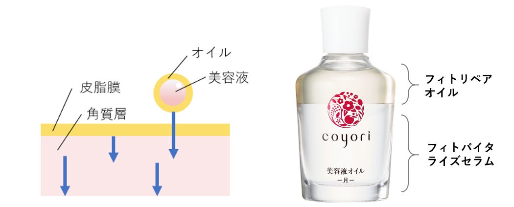 美容液オイルは、オイルと美容液(セラム)の二層からなる製品。皮脂に近づくようブレンドした“フィトリペアオイル”は肌表面の皮脂膜への親和性が高く、肌馴染みが良いため、美容液層の“フィトバイタライズセラム”を包み込んで、肌奥 へ浸透させます。そのためべたつかず、さらっとした使用感。ジェルやクリームでは含有できるオイル量が限られますが、二層式にすることで フィトリペアオイルをたっぷり配合することも実現しました。