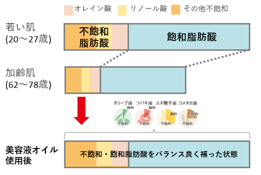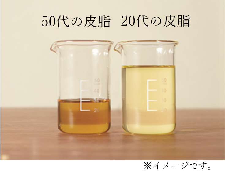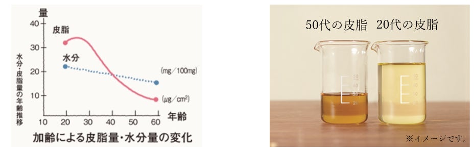 肌は季節によって皮脂量が変わり、バリア機能の役目をもつ皮脂量は 20,30 代をピークに急激に減少。さらに皮脂は加齢とともに飽和脂肪酸と不飽和脂肪酸バランスが崩れます。