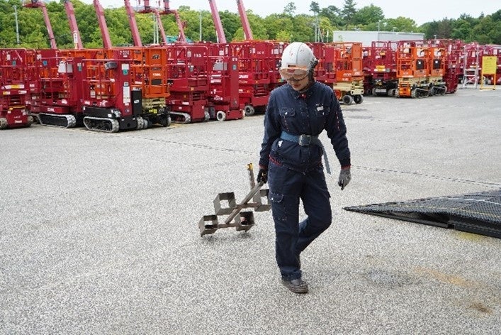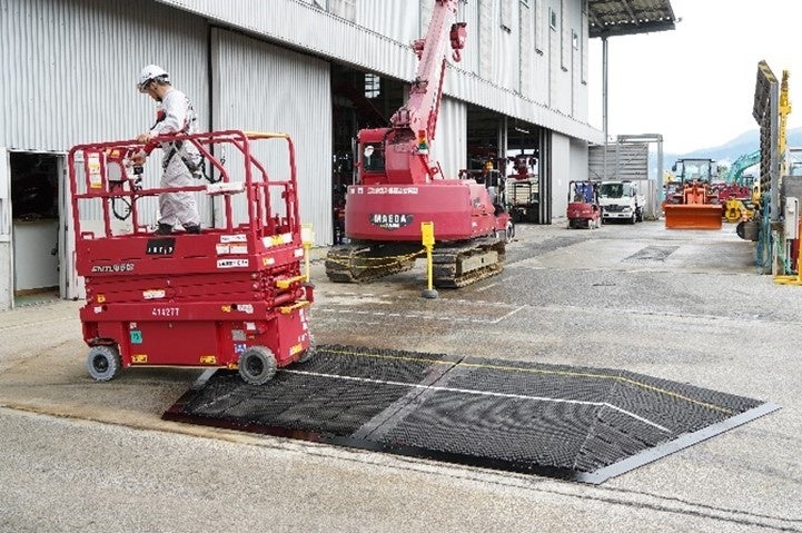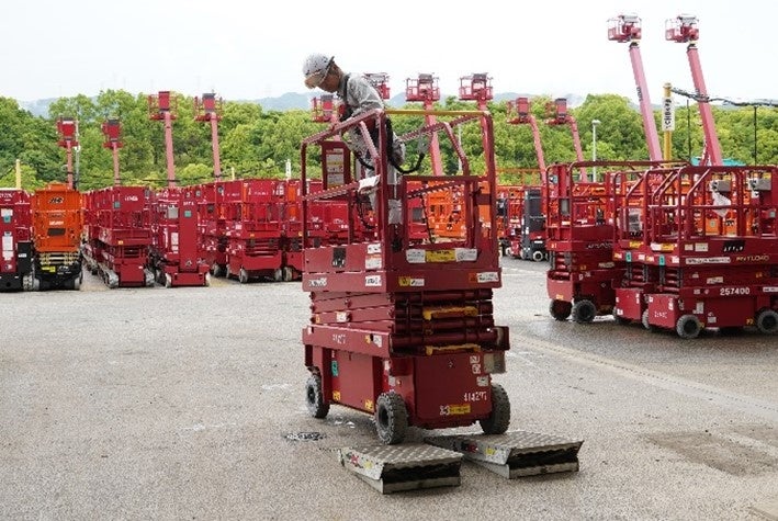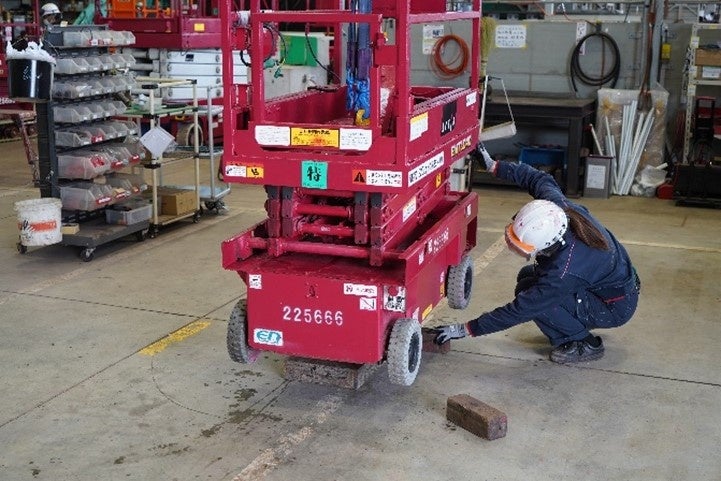 高所作業車は、転倒のリスクを回避するため、傾斜地ではデッキ(作業床)が上昇しないよう、自動的にストッパーがかかるようにセンサーがついており、この安全機能が正常に働いているかどうかを検証するため、レンタルの出庫前に高所作業車の本体を傾斜地に置いて点検を行います。従来は、床に2台の小型スロープを車幅に合わせて置き、そこに高所作業車を乗り上げる方法で行っていましたが、転倒のリスクがありました。また、前傾斜の検証後に後傾斜を調べるために車両をUターンする必要があり、時間的なロスもありました。