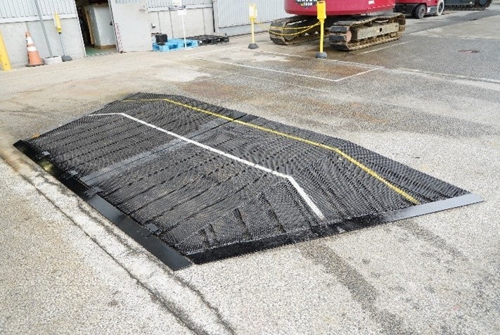 今回作成した点検台は、高所作業車が一方向に点検台を通過するだけで、前傾斜と後傾斜に加え、これまで難しかった横傾斜の点検も連続して行えます。室内系高所作業車の中で最も大きな9.9mタイプにも対応する大きなサイズとなっており、タイヤやクローラがスロープから外れ転倒するリスクを大幅に軽減することができました。また、Uターンの手間もなくなり、効率化にもつながりました。