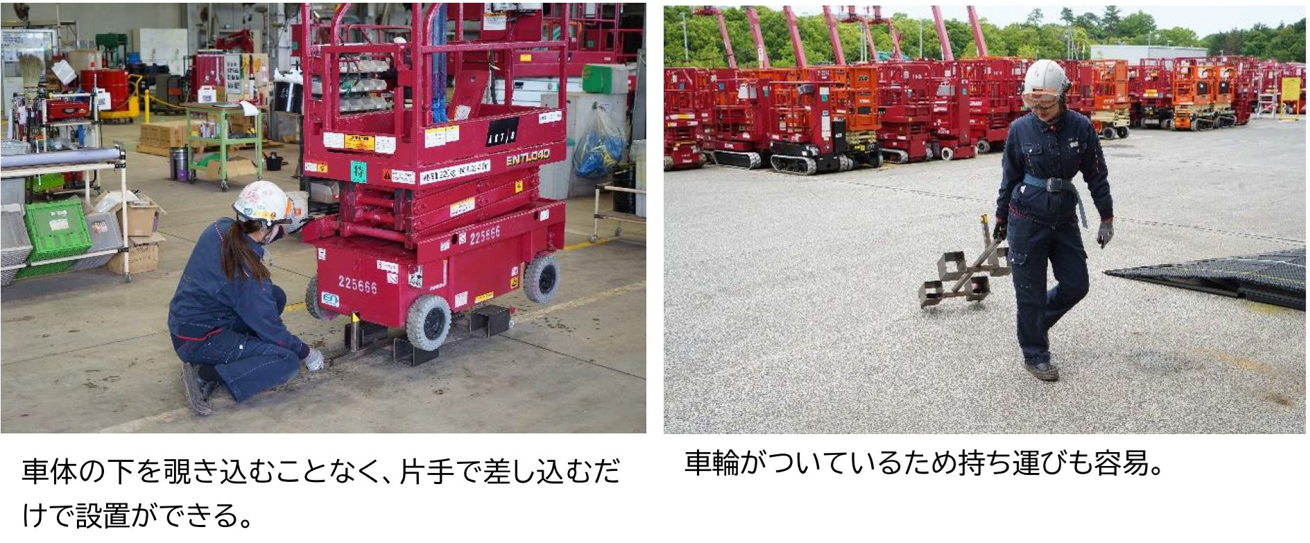 現場から戻ってきた室内系高所作業車は、クローラやタイヤの交換、清掃などの整備を行います。その際に従来は、クレーンで高所作業車を吊り上げ、車体の下を覗き込むようにして4片の木材を差し込み、車体を載せていましたが、木材を置く位置が分かりづらく、車体と床に手が挟まれたり、車体が転倒するリスクがありました。また、クレーンの吊り降ろし作業を慎重に繰り返しながらセッティングを行うため、時間を要していました。