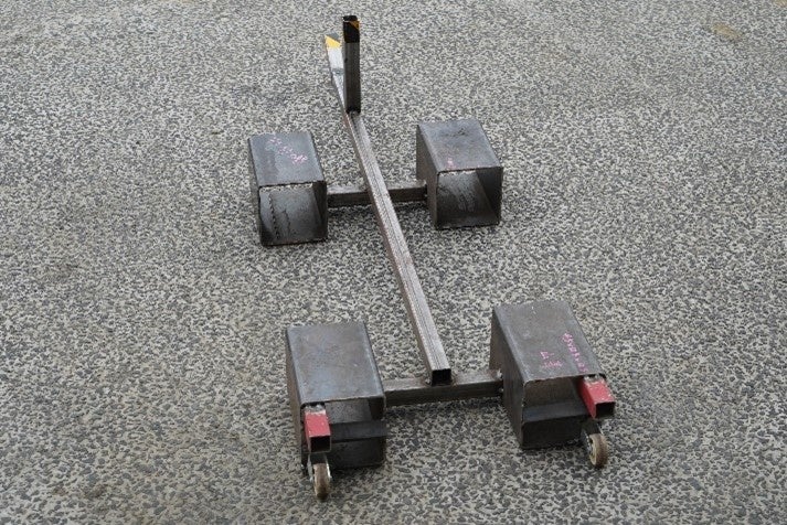 今回作成した台車は、北越工業株式会社の高所作業車ENCL・ENTLシリーズに対応した専用台車です。高所作業車の車体下部に合わせて4つの鉄製の台がつながった仕様で、クレーンで吊った車体の下に片手でスライドして差し込み、ストッパーが車体に触れたところで車体を降ろせば位置が合うようになっています。安全性の向上とともに、時間も従来の半分以下になり、効率化を実現しました。