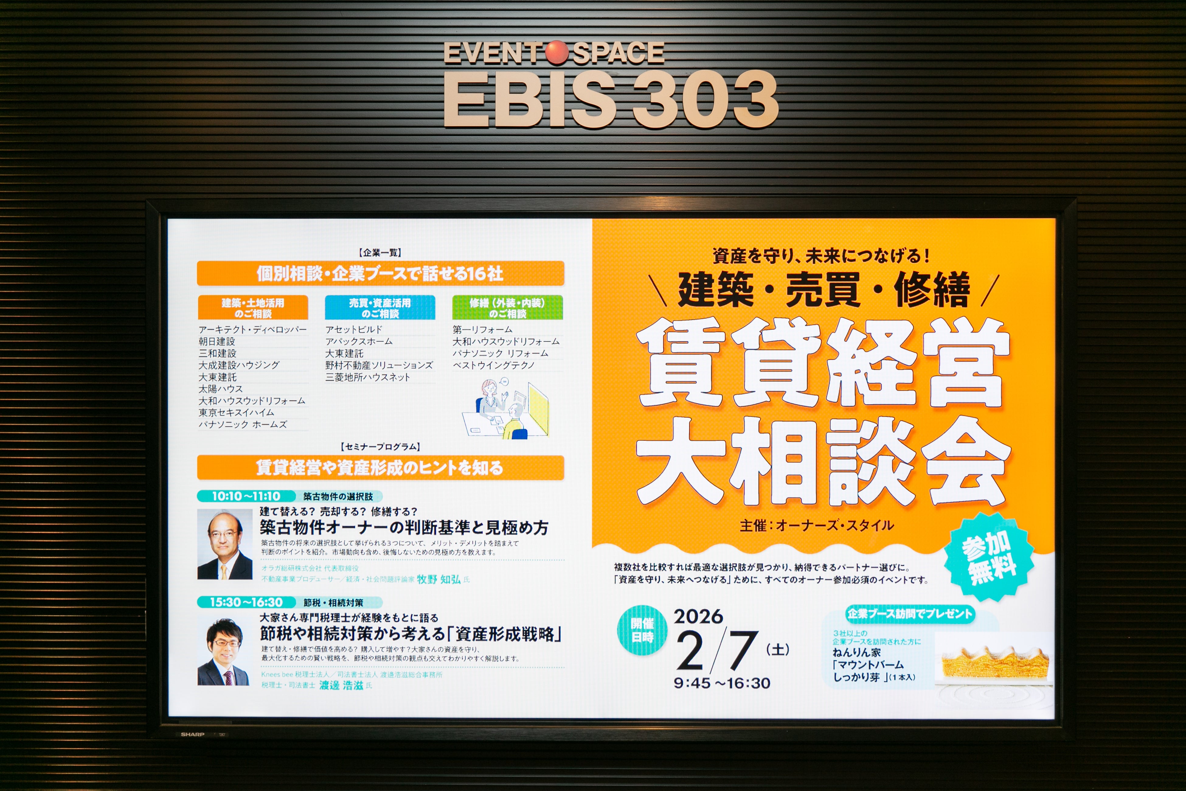 株式会社アーキテクト・ディベロッパー(本社:東京都中央区銀座、代表取締役社長:木本 啓紀、以下「ADI」)は、2026年2月7日(土)に開催されたオーナーズ・スタイル主催 「賃貸経営大相談会」 に出展しました。当日は雪が降る天候となったにもかかわらず、162組213名が来場し、当社ブースにはアンケート回答ベースで18名のオーナー様が相談に訪れました。相談内容は、空室対策や収益改善といった運用面に加え、「建て替えるべきか、このまま活用すべきか」「売却と保有のどちらがよいか」など、意思決定を前提とした具体的な論点が中心となりました。