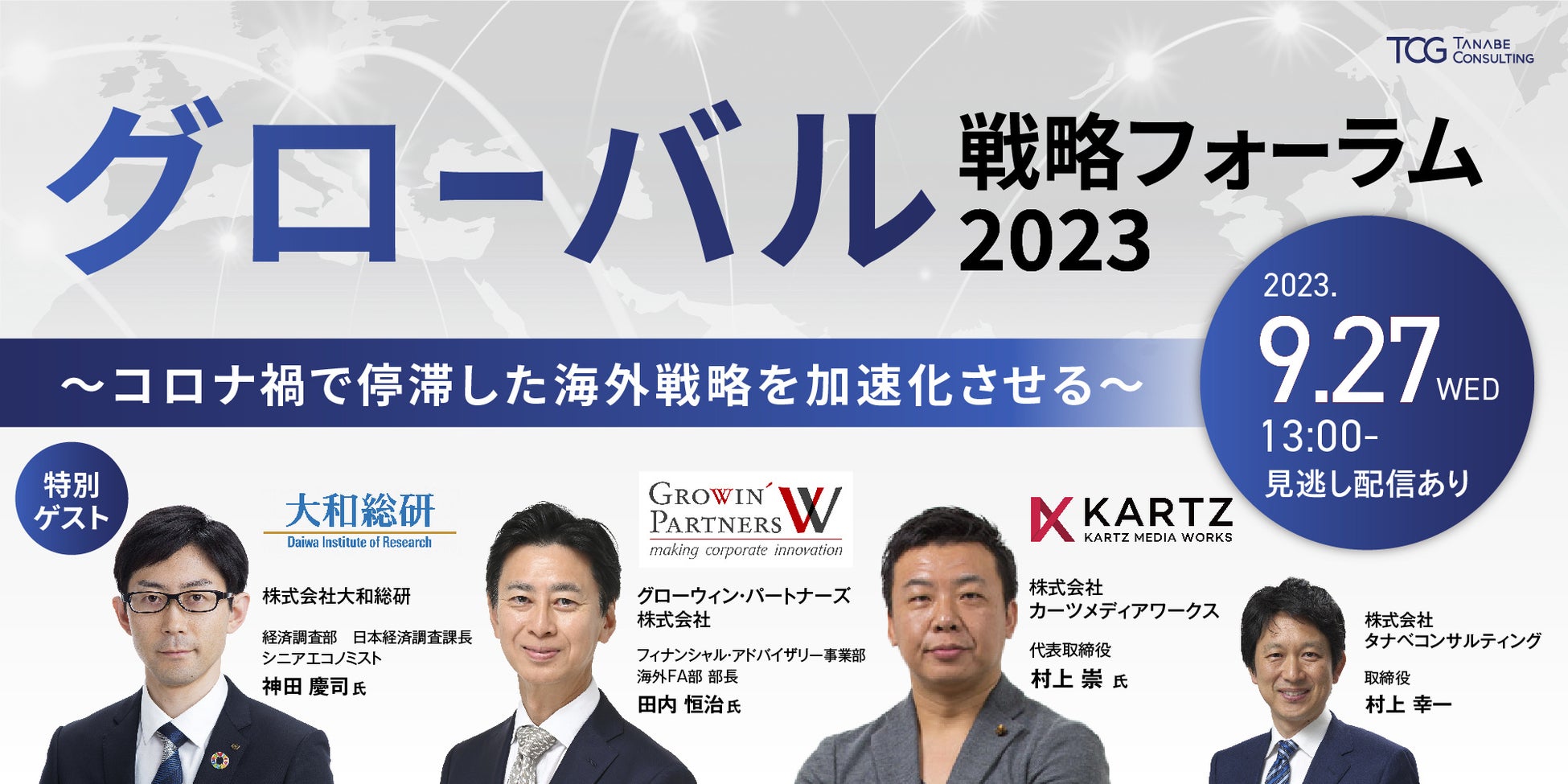 本フォーラムでは、特別ゲストとして株式会社大和総研 経済調査部 日本経済調査課長 シニアエコノミスト 神田 慶司 氏にご登壇いただくほか、株式会社タナベコンサルティング 取締役 村上 幸一、タナベコンサルティンググループ(TCG)であるグローウィン・パートナーズ株式会社 フィナンシャル・アドバイザリー事業部 海外FA部 部長 田内 恒治 氏、株式会社カーツメディアワークス 代表取締役 村上 崇 氏より、グローバルマーケティング、M&A、PRといった様々な視点から“海外戦略を「攻め」で推進していく事例や手法”について解説いたします。