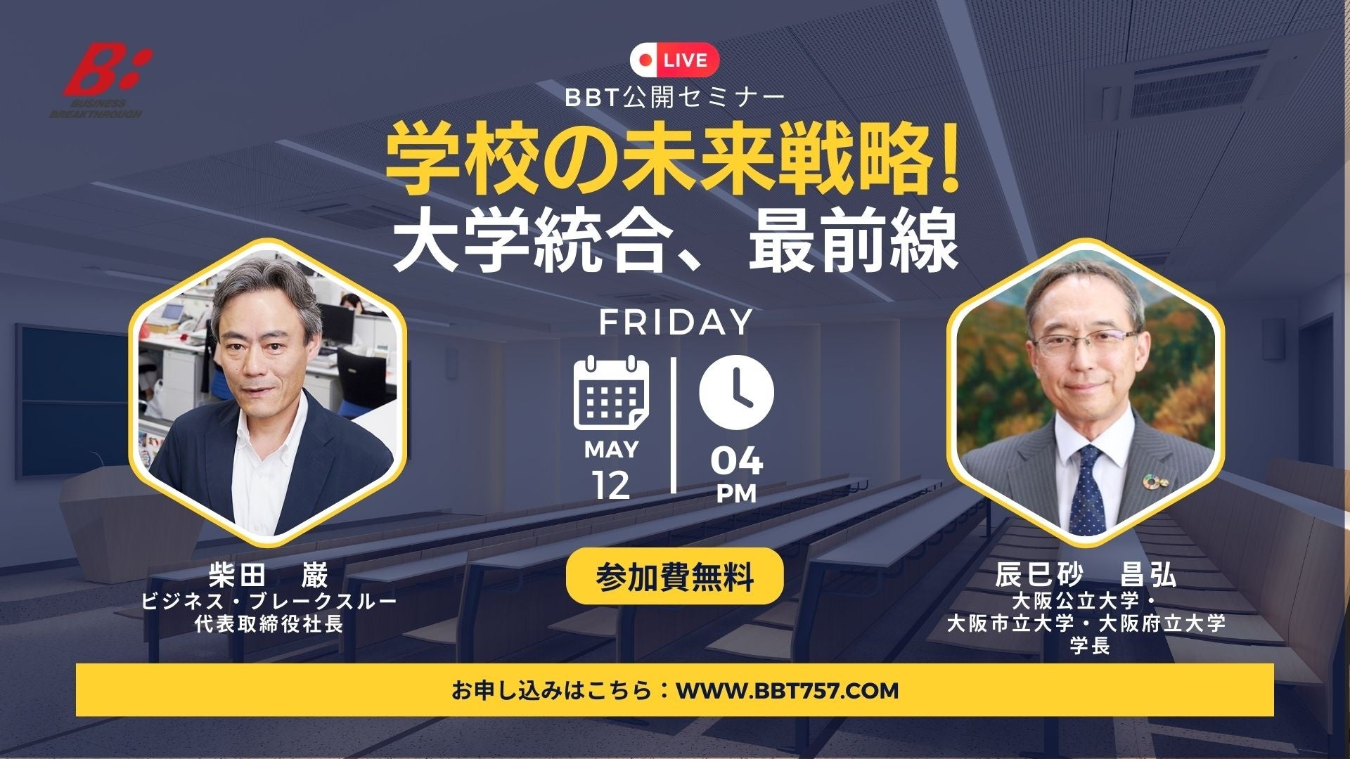 第2回目となる本回では、株式会社ビジネス・ブレークスルーの代表取締役社長である柴田巌と、大阪公立大学の辰巳砂昌弘学長が登壇し、日本の大学の現状課題の一例や、これからのあり方や方向性について対談します。