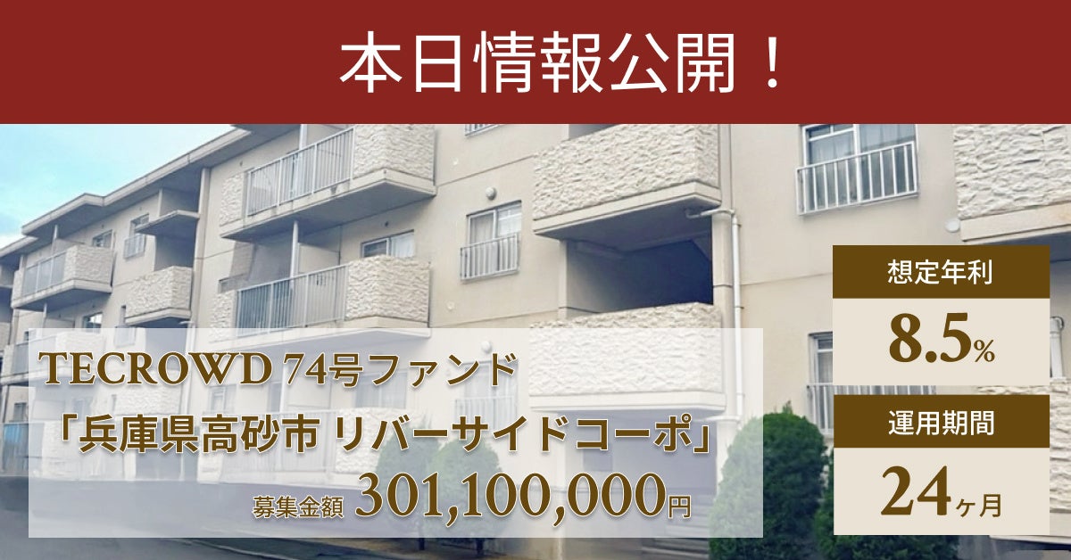この度新たに74号ファンド「兵庫県高砂市 リバーサイドコーポ」の情報を2025年1月16日(木)より公開し、2025年1月21日(火)18時より募集を開始いたします。
