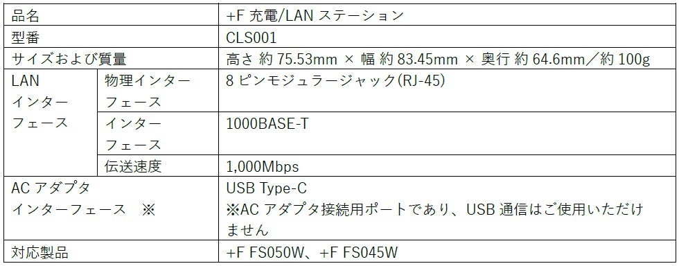 なお、「+F 充電/LANステーション」は、5Gモバイルルーター「+F FS050W」にも対応しております。