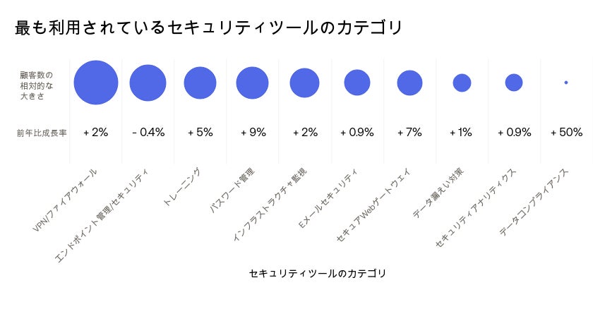 最も利用されているセキュリティツールはVPN/ファイアウォールであり、Oktaのお客様の過半数が導入しています。今回の成長率は前年比2%でした。日本においても、セキュリティツールの中でVPN/ファイアウォールの成長率が最も高く、前年比32%の成長率でした。