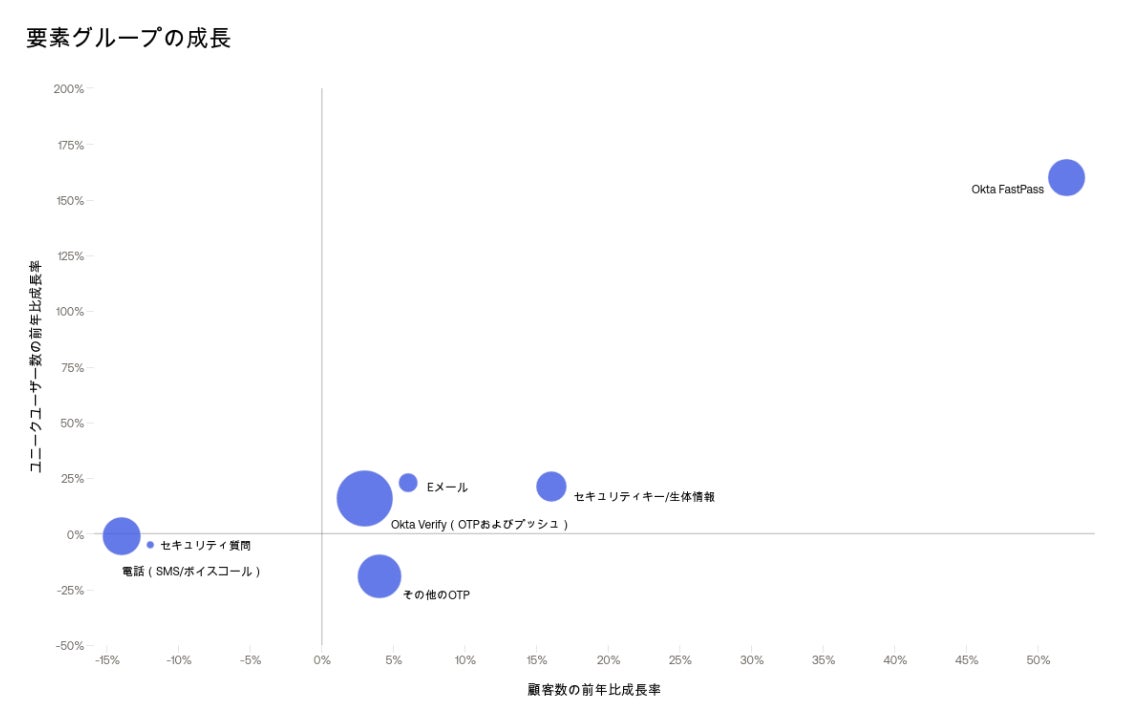 あらゆる規模のOktaのお客様がフィッシング耐性のある認証要素へと急速にシフトしていることが判明しました。フィッシング耐性を備えたパスワードレス認証のMFA要素であるOkta FastPassは、前年比52%増と大幅に成長しており、セキュリティキーや生体認証の成長率も前年比16%増となりました。