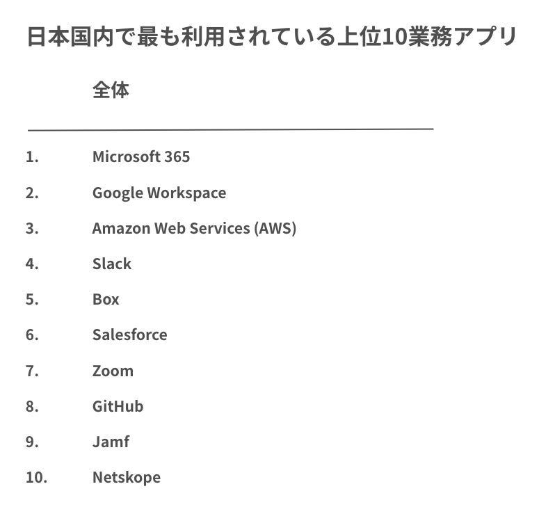 顧客数別の全体ランキングは、前回から大きな変動はありませんが、GitHubが昨年の9位から8位へ上昇しました。実際、GitHubは、今回の調査で日本国内で最も成長率の高いアプリとなり、25%の成長率を記録しました。また、Box(5位)とNetskope(10位)は昨年に引き続き上位10位内にランクインしており、これらはグローバルのランキングには見られない日本独自の傾向です。