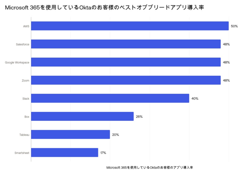 OktaのMicrosoft 365のお客様を対象に、Microsoft 365の生産性スイートと併用しているベストオブブリードのアプリの割合を調べています。