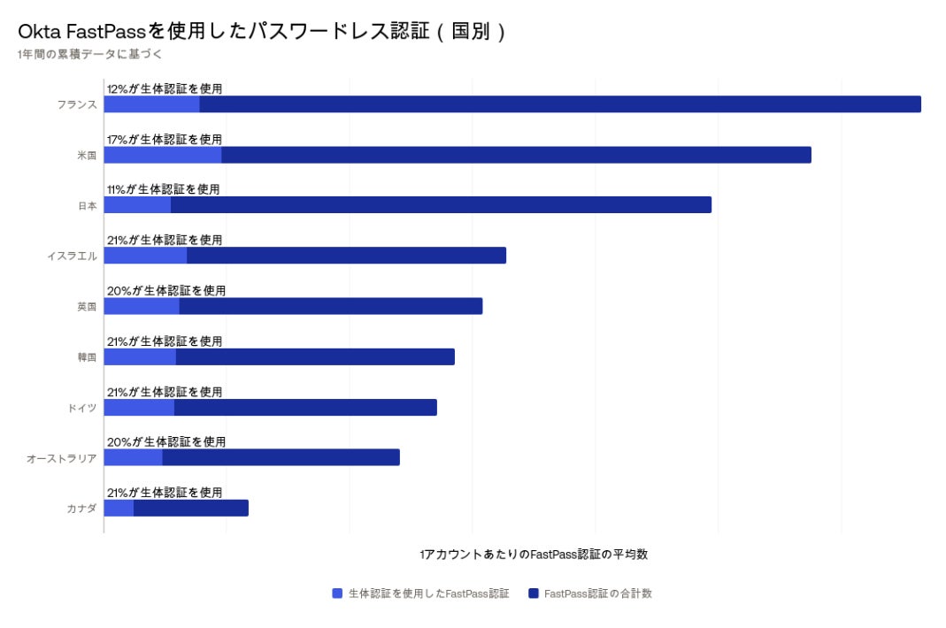 国別利用状況を分析すると、お客様1社あたりのOkta FastPassによる平均認証件数はフランスがトップでした。米国は2番目に高い平均認証件数でした。日本は、3番目に高い平均認証件数ですが、他の国と比較して生体認証の採用率が最も低くなっています。