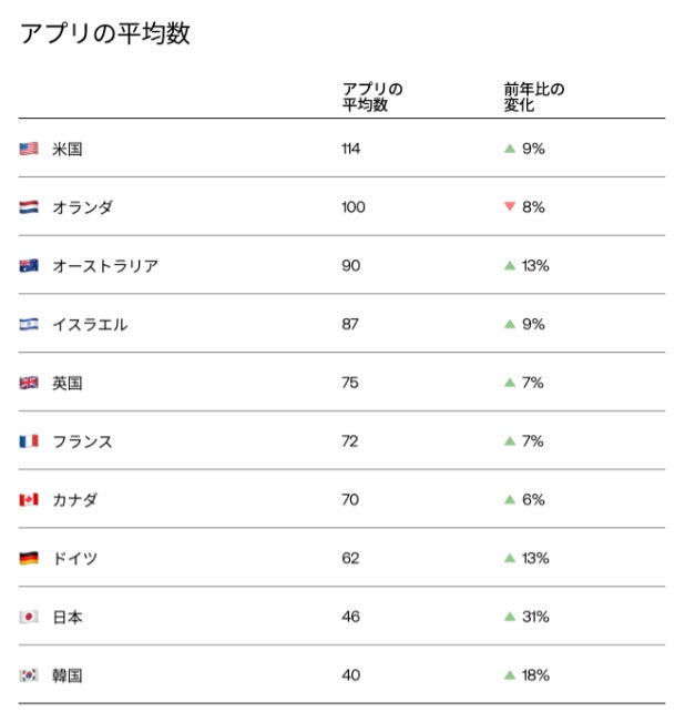 国別では、米国が最も多く、前年比9%増の平均114個となりました。前回、日本は平均35個で最も少ない数でしたが、今回の調査では前年比31%増の平均46個となり、国別で最も高い成長率を記録しました。