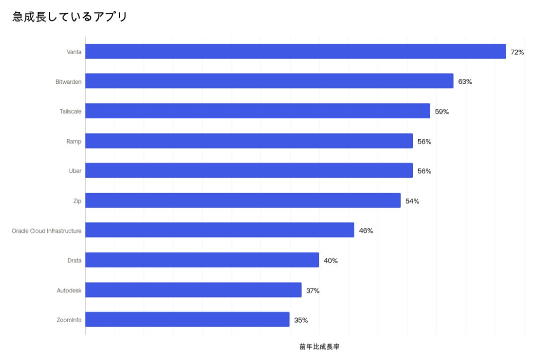 今回、新たにランクインしたアプリとして、パスワード管理アプリのBitwarden(2位)、法人向け出張サービスに注力しているUber(5位)、調達ツールのZip(6位)、クラウド基盤のOracle Cloud Infrastructure(7位)が挙げられます。