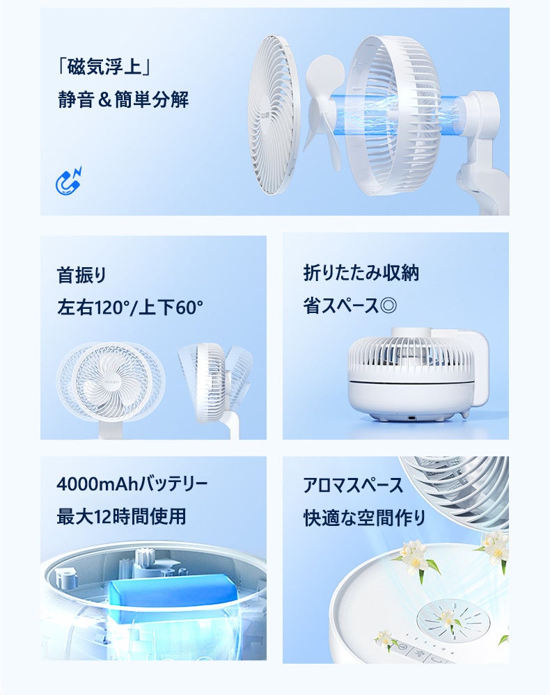 ファンが磁力でふわりと浮きながら回転する独自構造により、摩擦を最小限に抑え、驚くほど静かな運転音を実現しました。