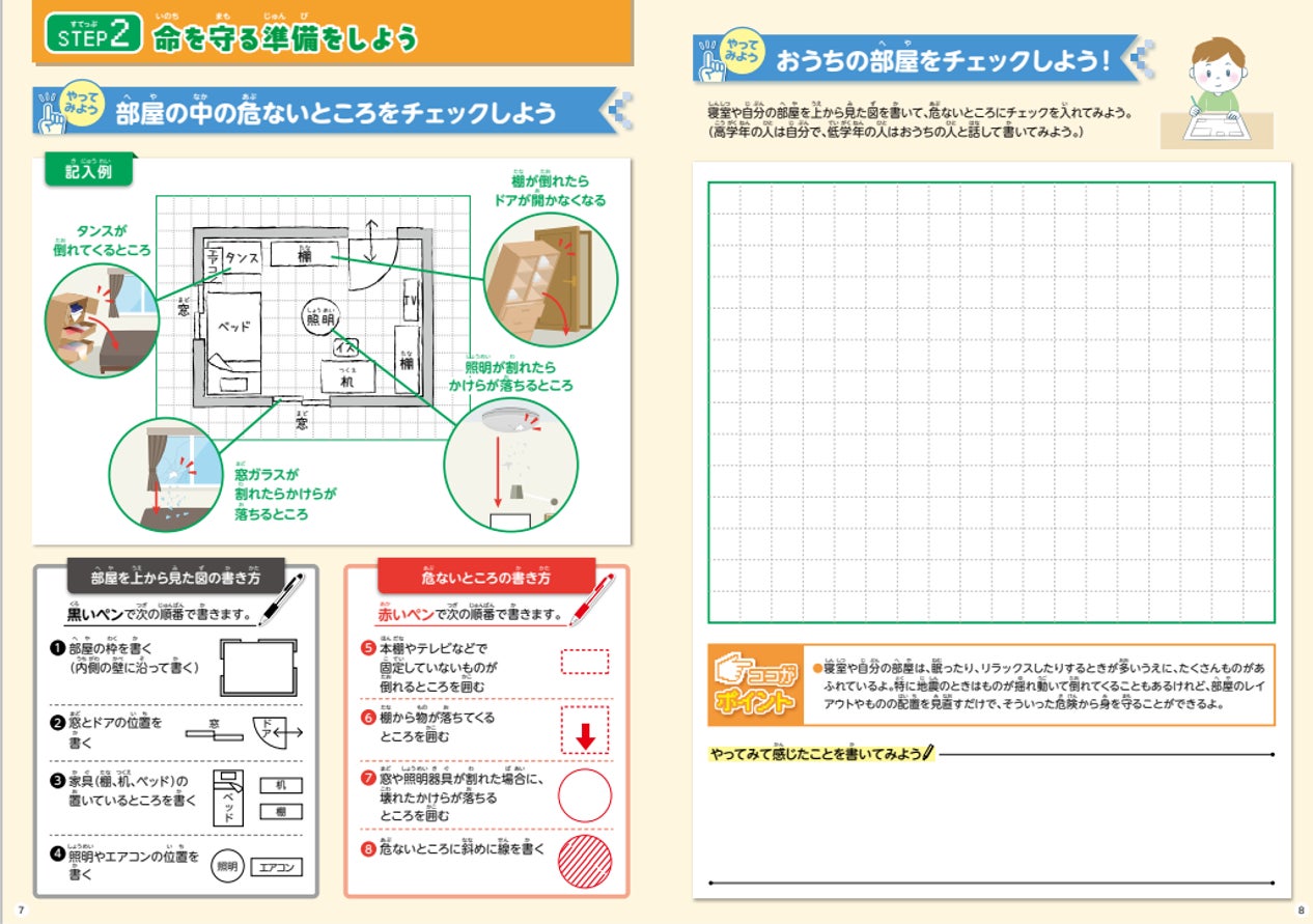 ワークブックにそって子どもたちにさまざまなアクションに挑戦してもらう防災教育プログラムです。災害から命を守るための具体的な方法や、ライフラインが使えない状況の疑似体験など、実践を通じて、楽しく防災知識・行動を学ぶことができます。