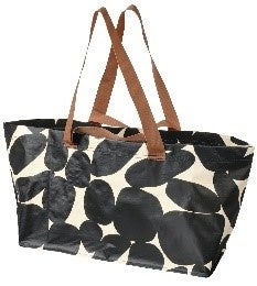 2通りの持ち運び方ができるグラフィック模様のやや小型のバッグ。持ち手を持つほかに、長いストラップを両肩に掛けて背負うこともできます。