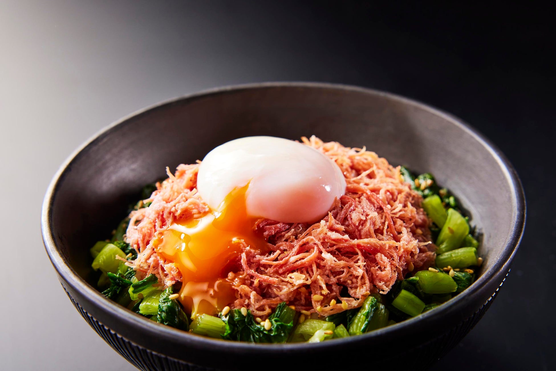 1949年千駄木で創業以来、松阪牛や近江牛などの銘柄牛をはじめとする精肉、そしてハムやソーセージといった食肉加工品を自社製造している千駄木腰塚の看板商品「自家製コンビーフ」を野沢菜と温泉卵で合わせたコンビーフ卵かけごはん(TKG)をご用意しました。