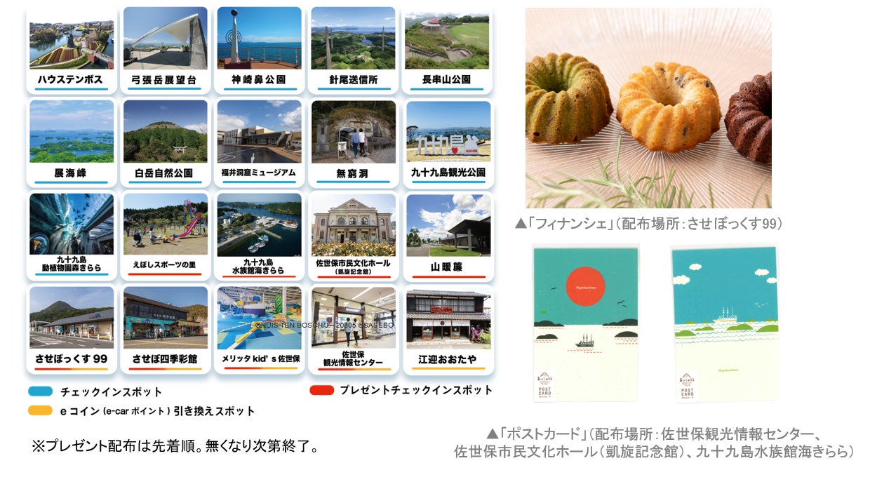 九州エリアにあるオリックスレンタカーとニッポンレンタカーの対象店舗で車を借りて、キャンペーンの参加証であるチラシを入手。佐世保市内にあるチェックイン対象の観光スポット20か所の内、2か所以上「STLOCAL」でデジタルチェックインすると、「させぼeコイン※」が指定の引き換えスポットで取得できます。また、プレゼントチェックインスポットでは、お土産もプレゼント。