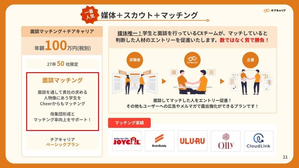 ベンチャー・成長企業のための就活サイト「チアキャリア」を運営している株式会社Cheer(本社:東京都新宿区、代表取締役:平塚ひかる)は、この度面談マッチング付きのチアキャリア新プランをリリースいたしました。本リリースを記念し、5社限定で最大20万円分のお得なキャンペーンについてご案内いたします。