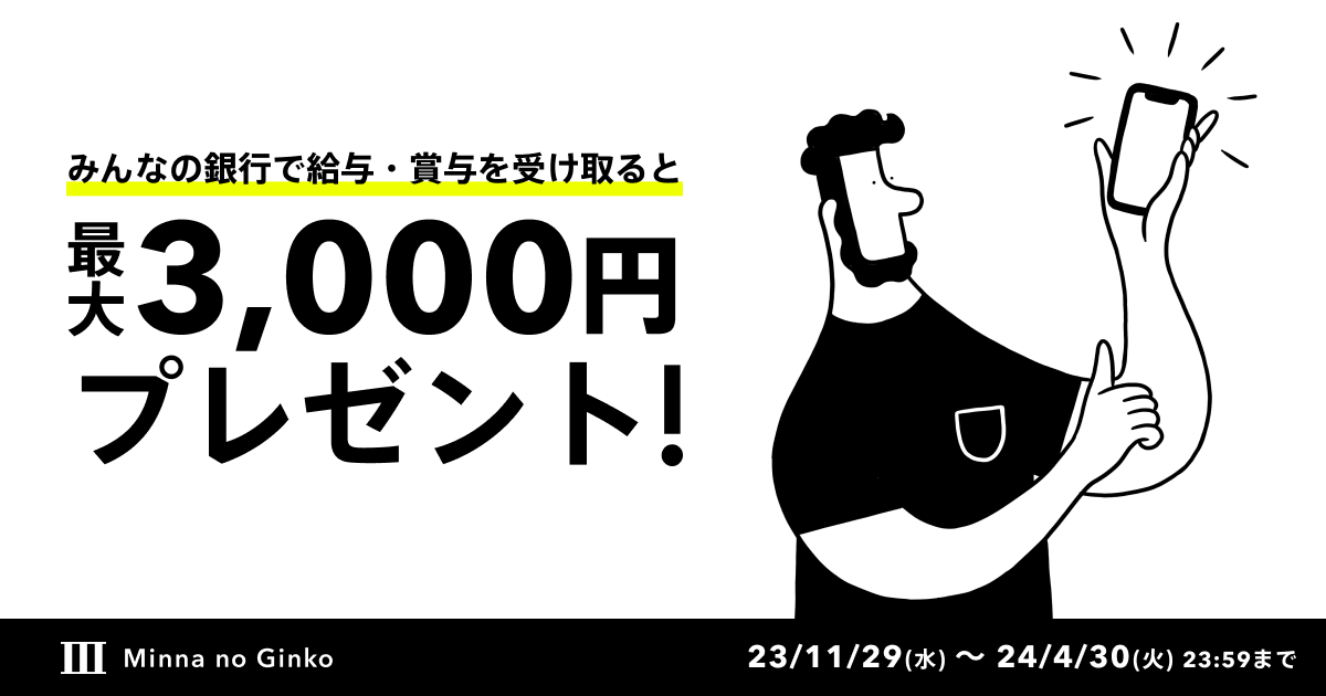 キャンペーン期間中にみんなの銀行口座で給与または賞与を受け取ったお客さまを対象に、最大3,000円をプレゼントします。