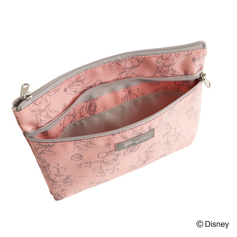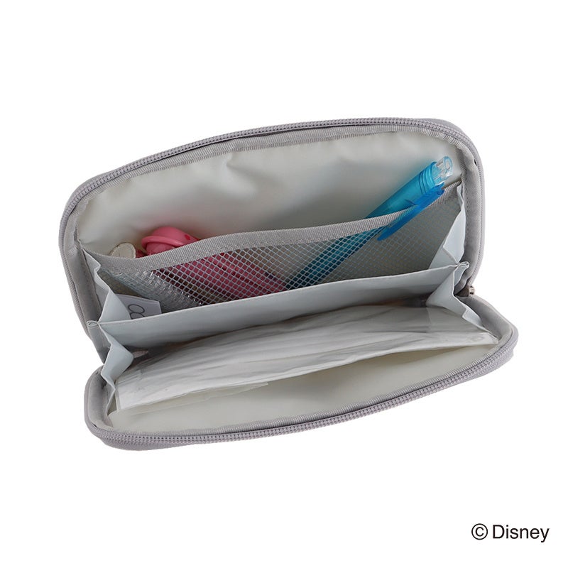 真ん中に仕切りが1つとメッシュポケットが付いています。開閉部にはファスナーがついており、コの字に開くので取り出しがしやすく、大きく開いても中身がこぼれにくい仕様になっています。