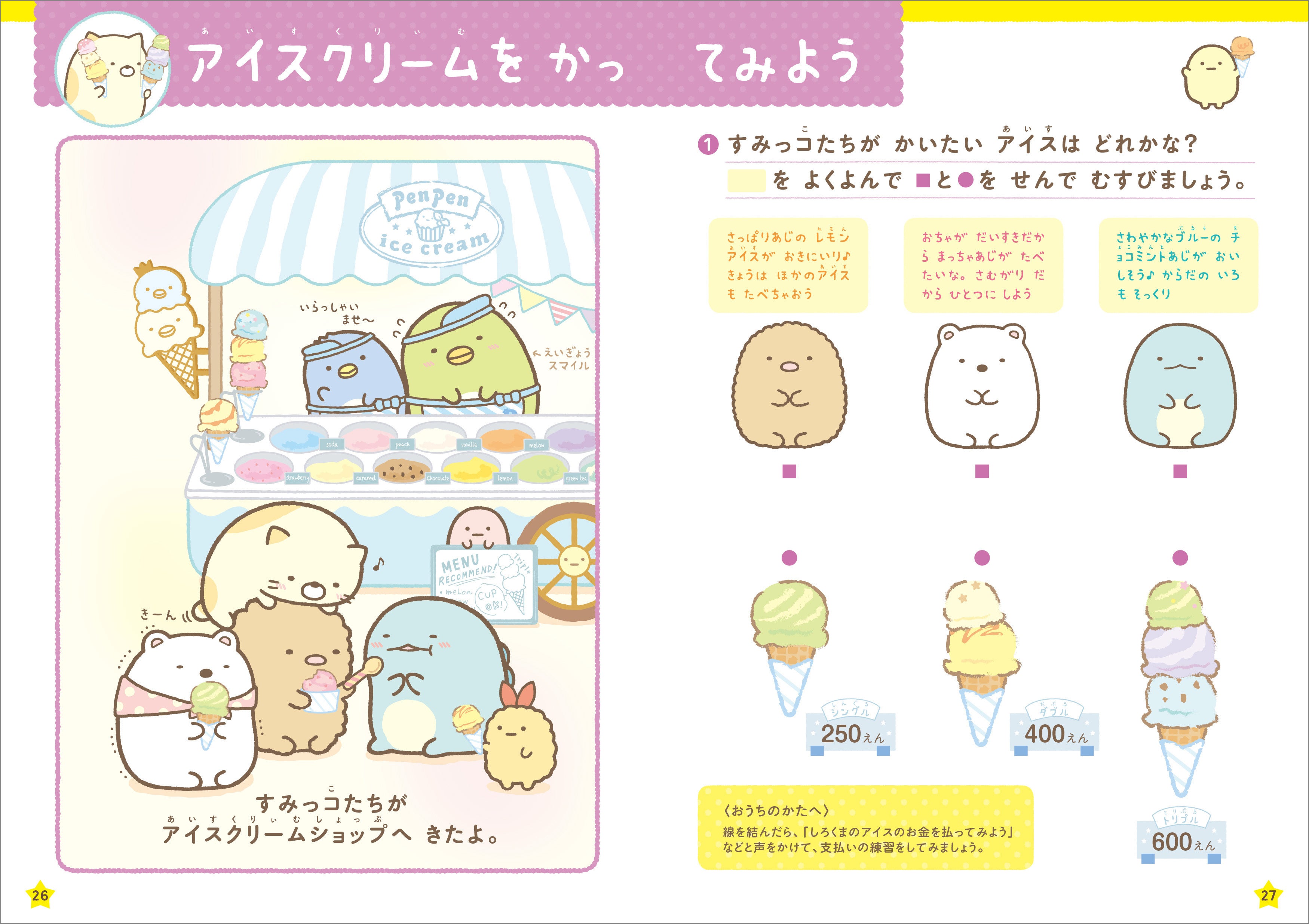 対象読者年齢は5〜7歳。お金の種類・数え方・大小などの基本を学ぶ問題からスタートして、すみっコたちとお買い物をしたり、お店へ行くような実践編へと進んでいく構成です。まるですみっコぐらしの世界に入り込み、すみっコたちと一緒にお金の使い方を勉強したり、お買い物をしているような気持ちで楽しく学べます。
