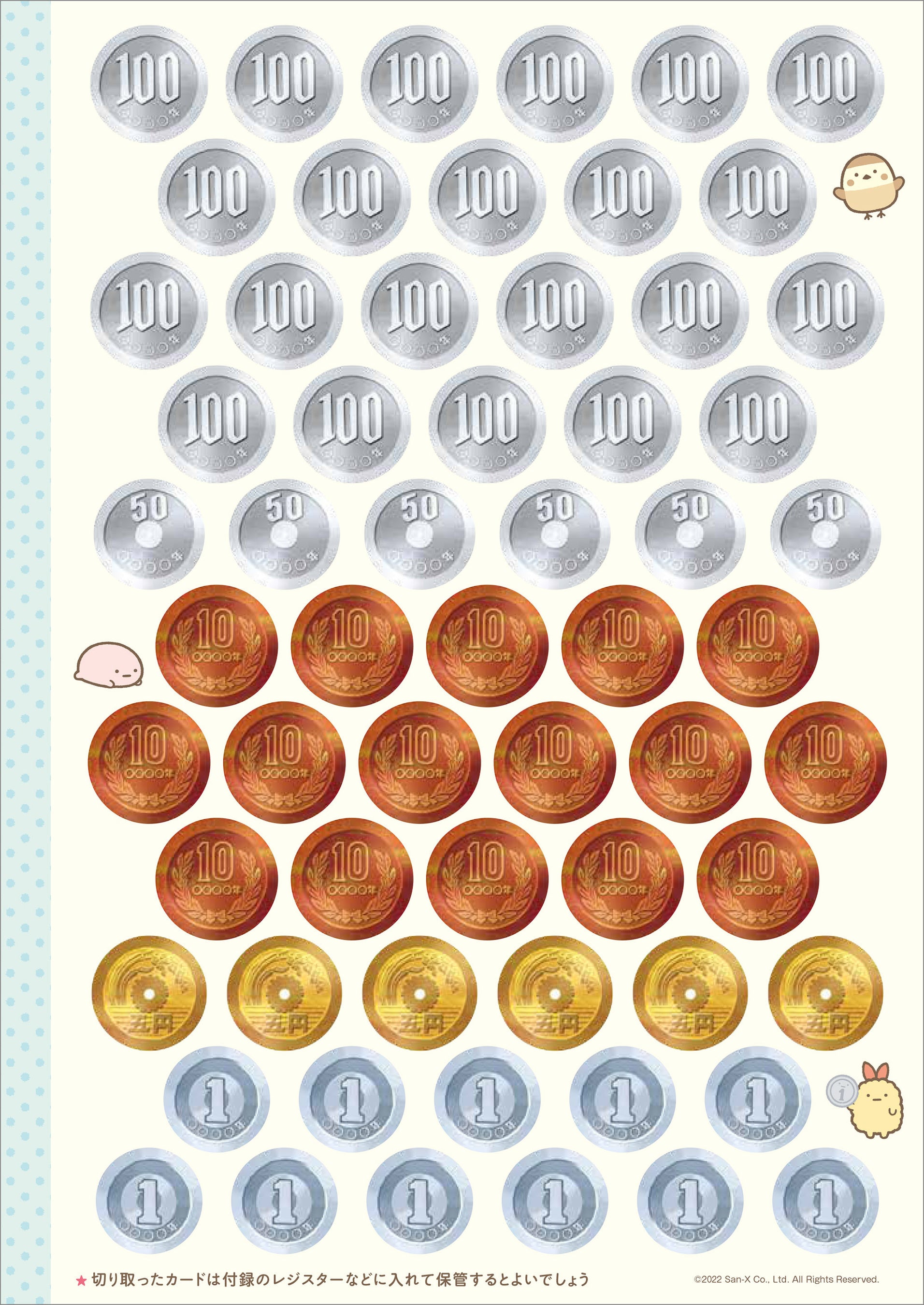 厚紙のおかねカードとかわいいすみっコぐらしデザインのレジスター付き。ドリルの問題だけでなく、家族やお友だちとのお買い物ごっこなどにも使えます。日常的に「お金」に慣れ親しむべく、遊びながら手軽に活用することができます。