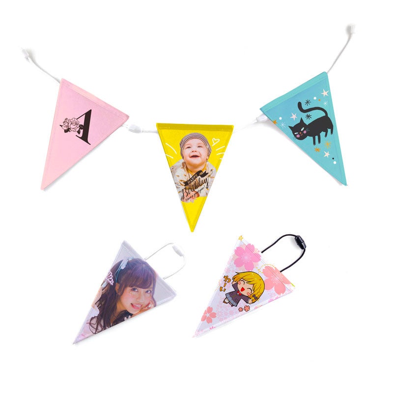 写真、イラスト、文字、デザインなど、お好みの要素を自由に組み合わせ、フルカラー印刷によって鮮やかな仕上がりを実現します。個性的でオリジナリティ溢れるガーランドで、イベントやパーティに独自の雰囲気をプラスしましょう。