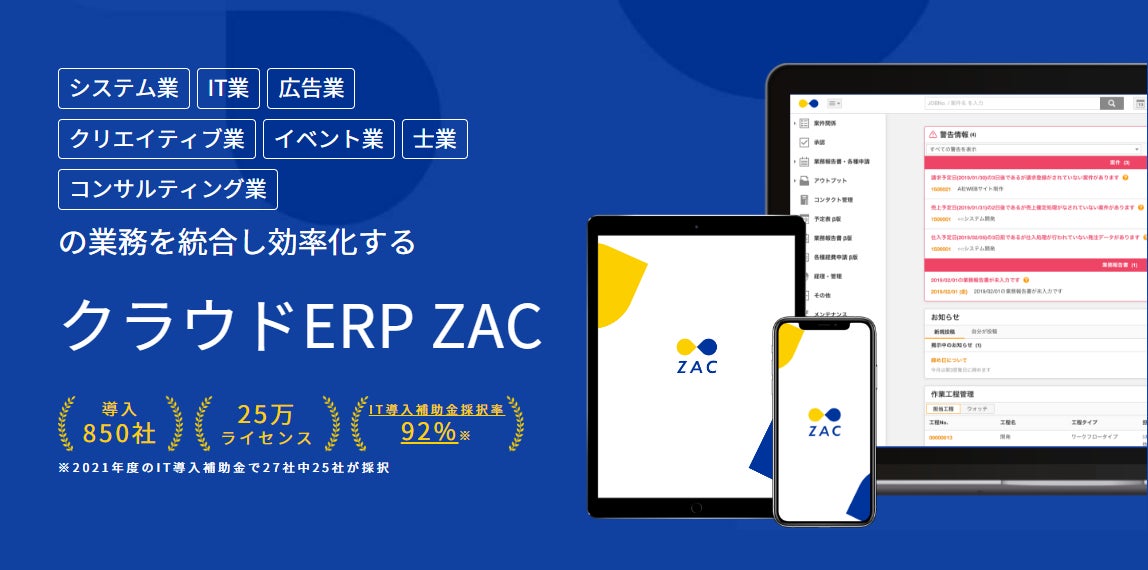 『クラウドERP ZAC』は損益管理、プロジェクト管理、管理会計、内部統制、決算早期化を実現する統合型の基幹業務システムです。ITサービス業、広告・クリエイティブ業、コンサルティング業をはじめとした知的サービス業を中心に累計900社を超える企業様に導入いただいています。