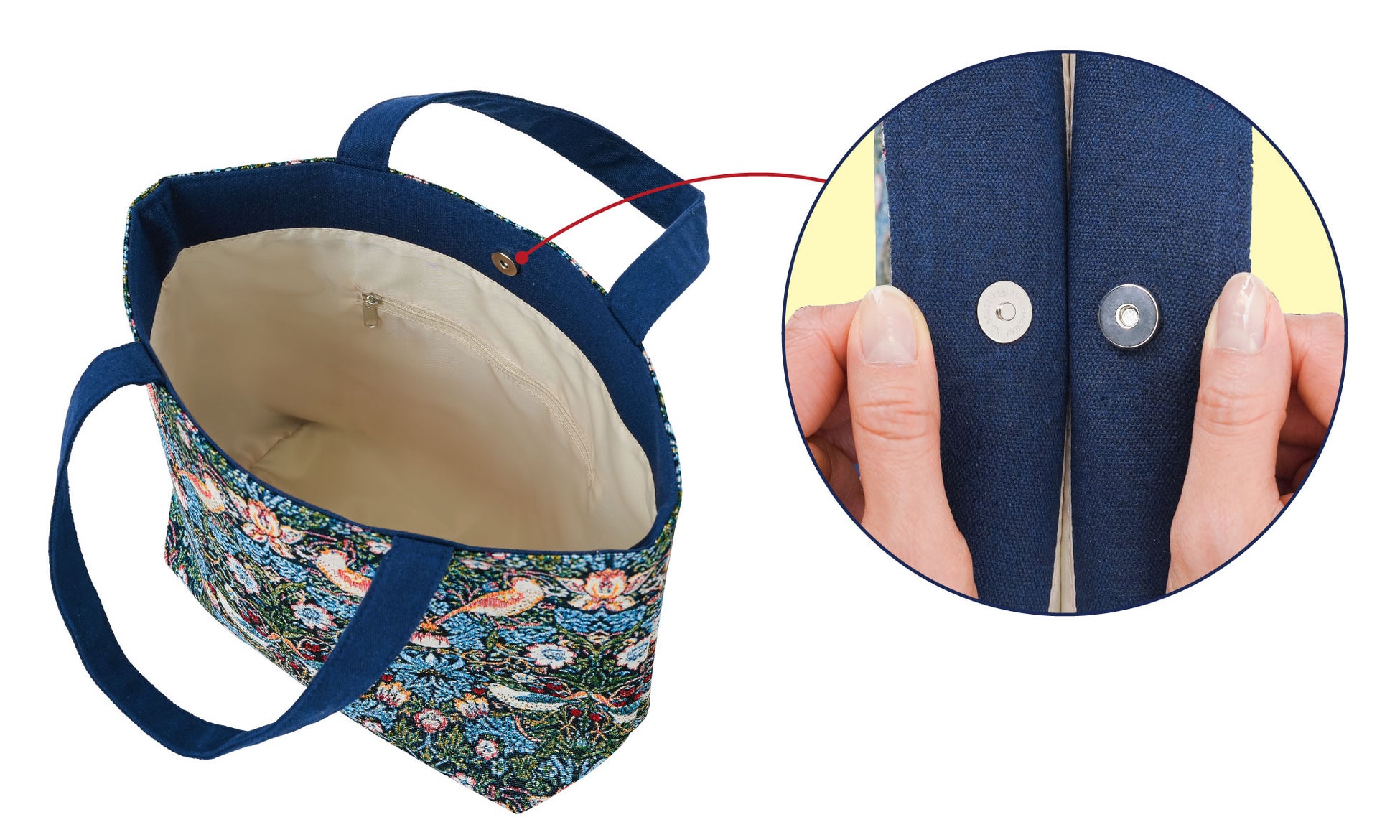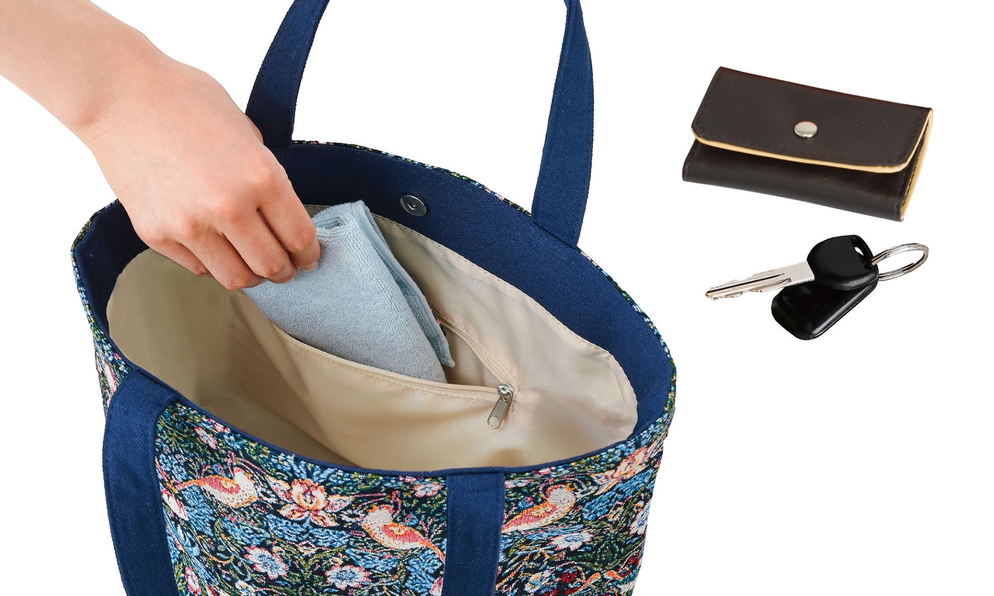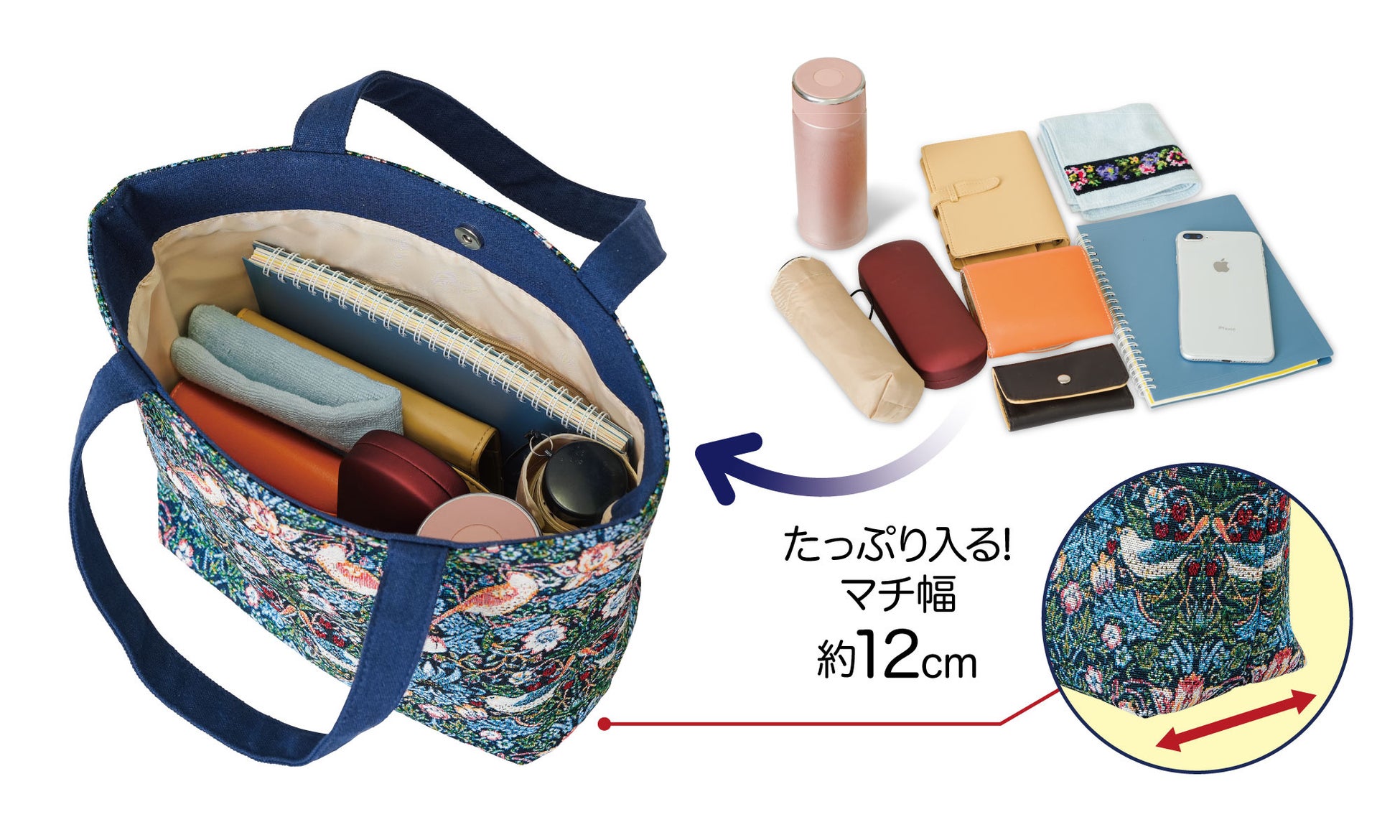 「モリス ジャガード織り手提げトートバッグ」は、見た目よりたっぷり入るマチ幅約12㎝で、お出かけ時の必需品や小物もスッキリ収納♪