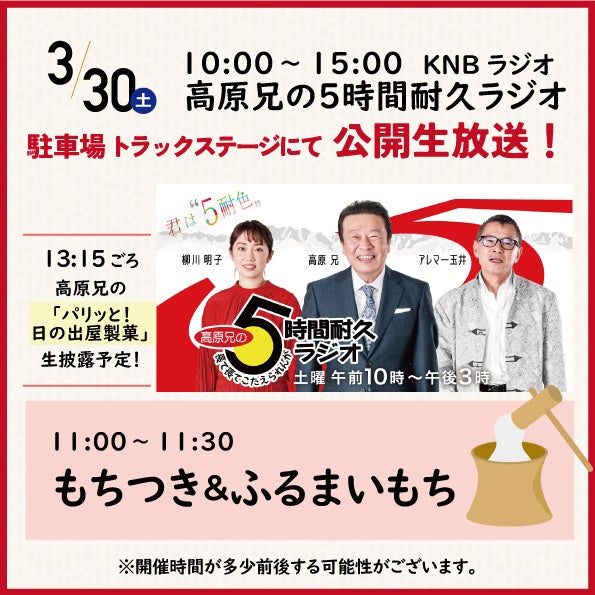 13:15頃・日の出屋製菓コーポレートソング、高原兄の「パリッと!日の出屋製菓」を生披露を予定。