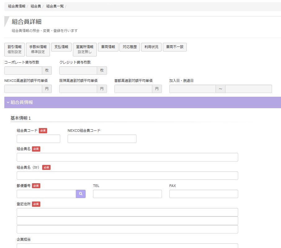 組合員に関わる情報(登記住所・TEL・FAX・担当者など)の管理はもちろんの事、車両・カード一覧や走行実績などを一元管理可能とし、エクスポート機能にてそれらの情報をダウンロードできます。