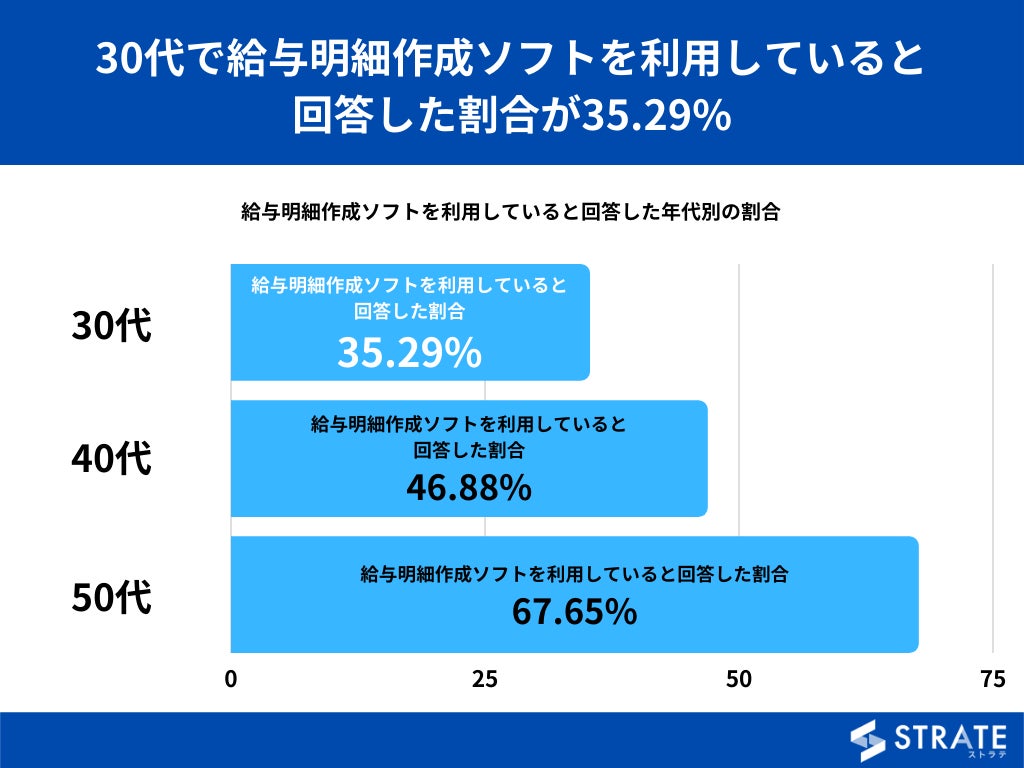 給与明細作成ソフトを利用していると回答した割合を年代別でみてみますと、50代が最も多く67.65%、次いで40代の46.88%、30代は35.29%に及びました。