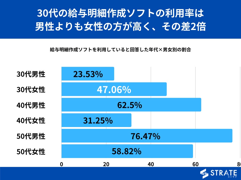 給与明細作成ソフトを利用していると回答した割合を年代×男女別でみてみますと、50代男性が最も多く76.47%、次いで40代男性の62.5%、30代は23.53%にとどまりました。