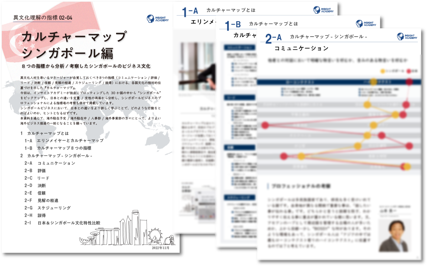 インサイトアカデミーでは、独自にプロッティングした30か国の中から、この度“シンガポール”をピックアップし、8つの指標を説明するとともに、日本との違いを定量 / 定性の両面から分析し、シンガポールビジネスのプロフェッショナルによる8つの指標毎の考察を盛り込んだ「国別カルチャーマップ シンガポール編」をリリースいたしました。
